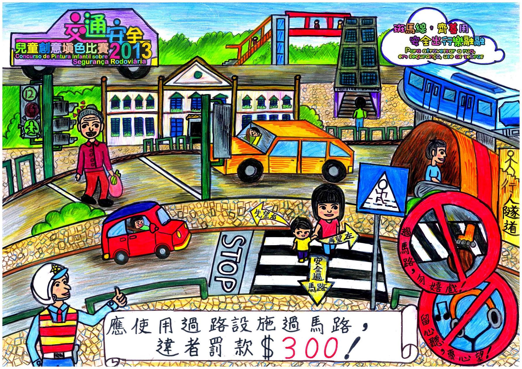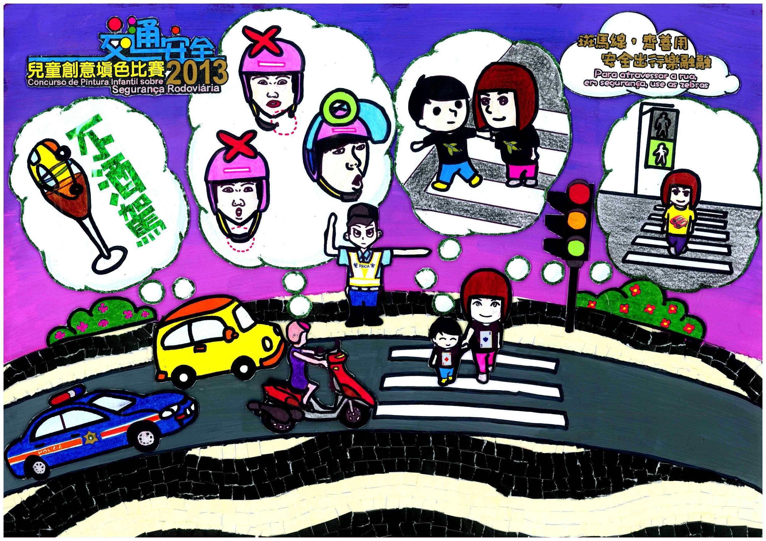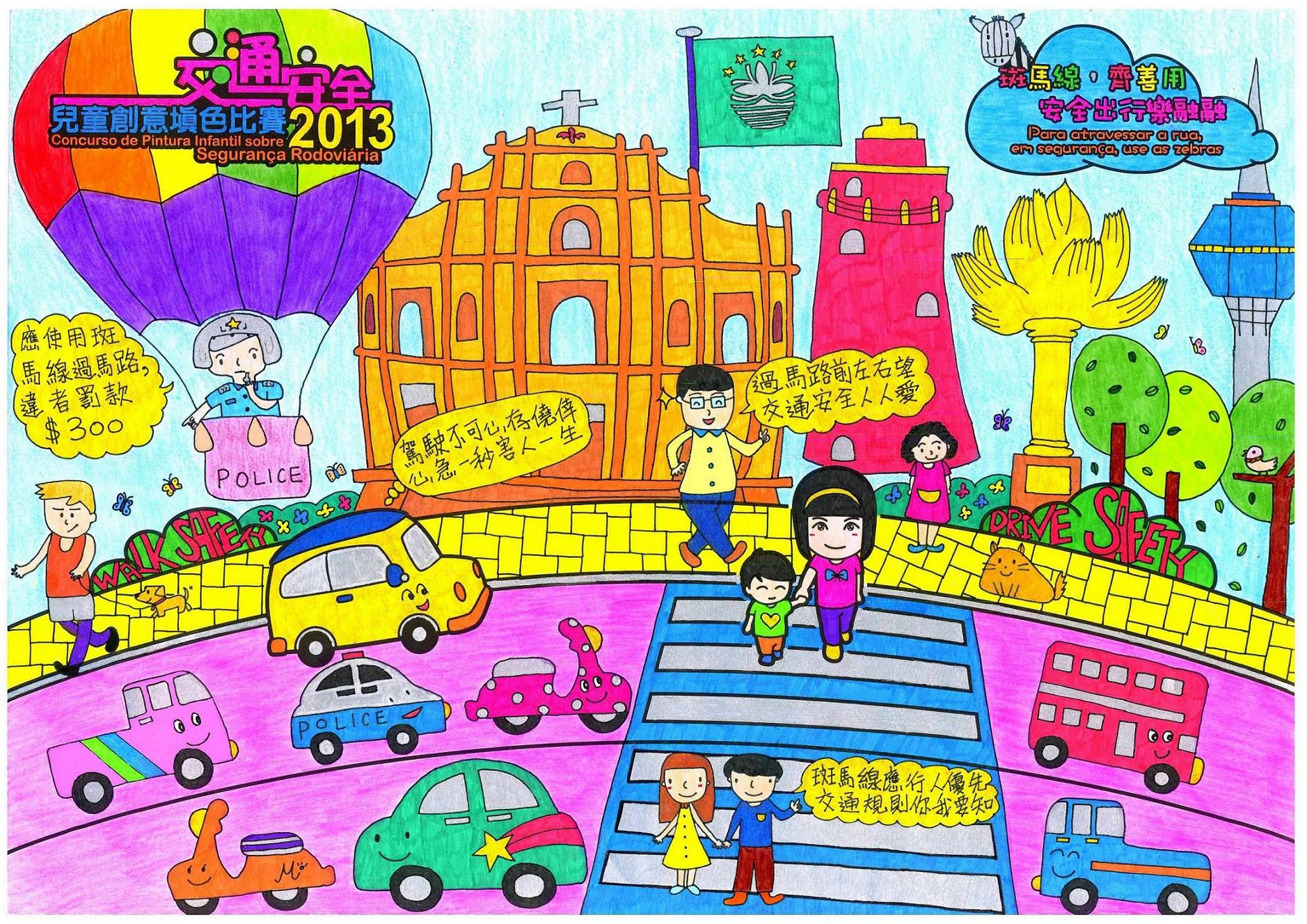 為宣揚交通安全訊息,交通事務局、治安警察局、法務局及民政總署今年再度合辦“交通安全兒童創意填色比賽",是次比賽亦是「2013年交通安全推廣」系列活動之一。主題為“斑馬線,齊善用,安全出行樂融融”,主辦單位希望透過填色及主題創作,提高小朋友善用並正確使用斑馬線安全橫過馬路,使小朋友從小培養良好的過路美德。