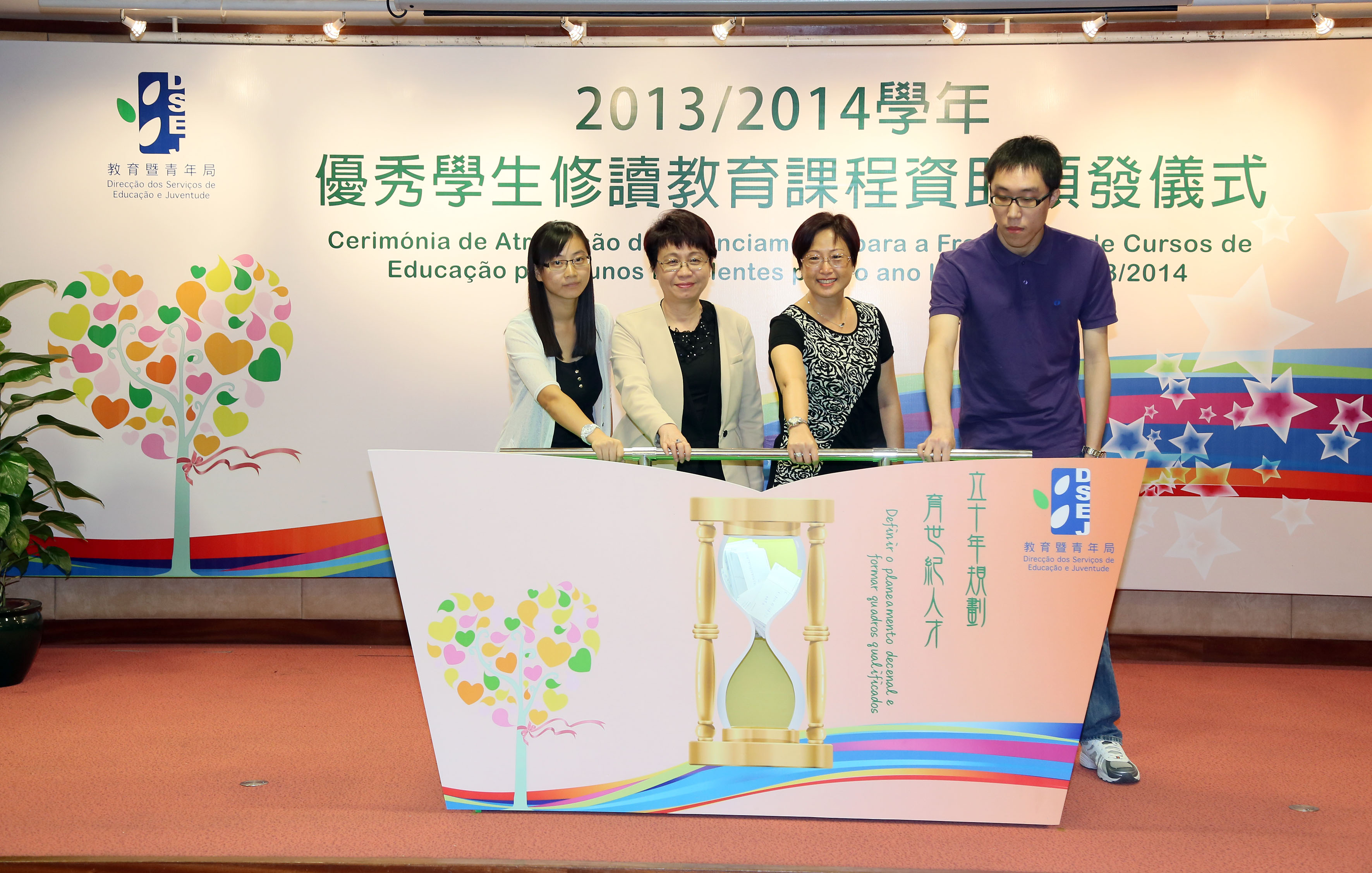 為表彰本學年獲選的學生,教青局於八月十六日舉辦“二O一三/二O一四學年優秀學生修讀教育課程資助頒發儀式”。出席儀式的嘉賓包括社會文化司司長辦公室主任張素梅、顧問惠程勇,教青局局長梁勵,以及獲選的應屆中學畢業生所就讀中學的校長。儀式同時邀請獲選學生家長及二O一二/二O一三學年受惠學生參加,共同分享獲選學生的喜悅。