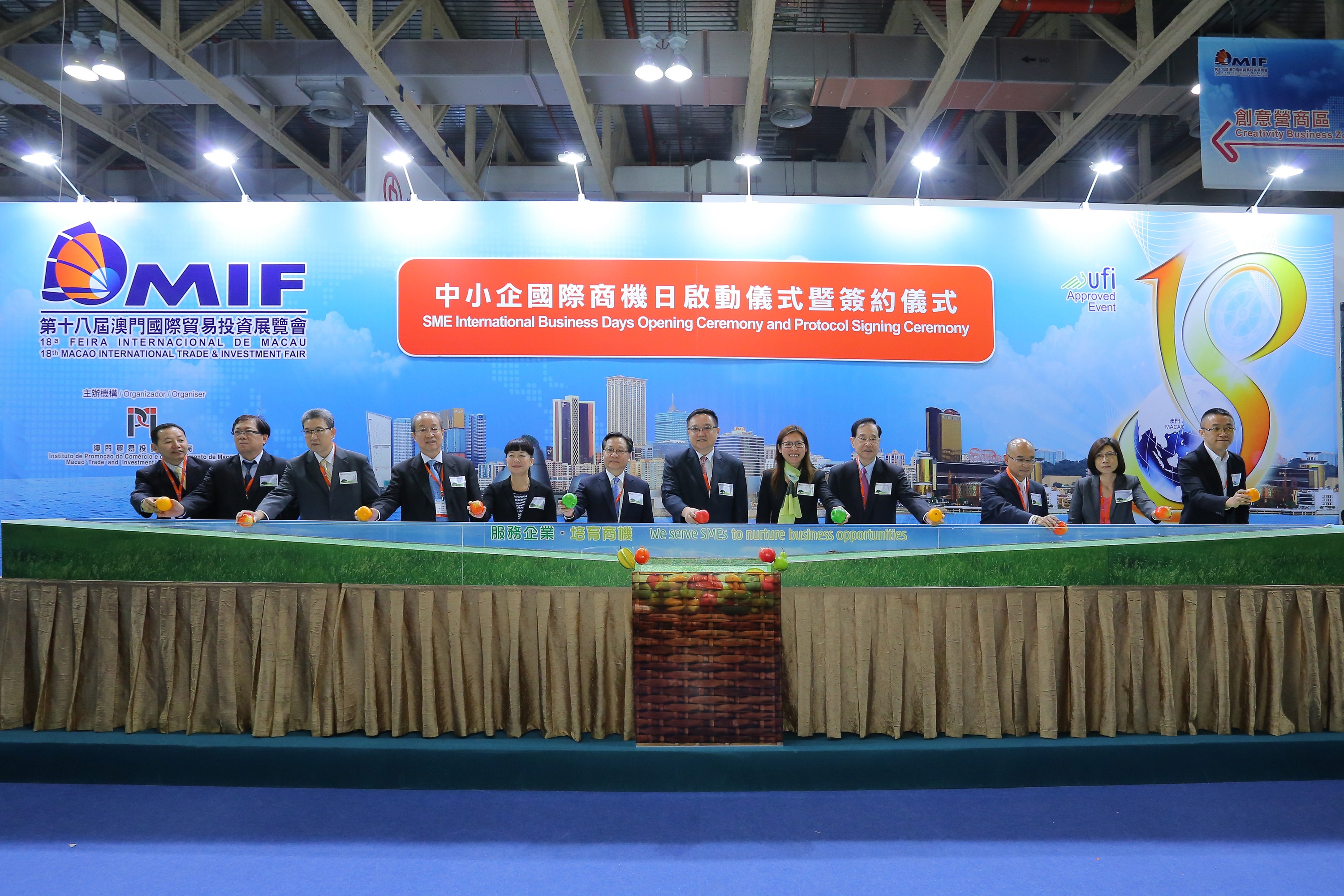 第18屆MIF「中小企國際商機日」(下稱「商機日」)今日舉行啟動儀式,邀請到澳門貿易投資促進局張祖榮主席、澳門中華總商會高開賢理事長、澳門貿易投資促進局陳敬紅執行委員、劉關華執行委員,澳門廠商聯合會崔煜林理事長、澳門付貨人協會鄧君方理事長、澳門管理專業協會劉永誠理事長、澳門中小企業協進會容應存副理事長、澳門生產力暨科技轉移中心莫苑梨副理事長、澳門紡織商會顧永祥監事、中國國際貿易促進委員會-商業行業分會-品牌管理研究中心田敏副主任和香港專利授權及特許經營協會李偉生會長等擔任主禮嘉賓。