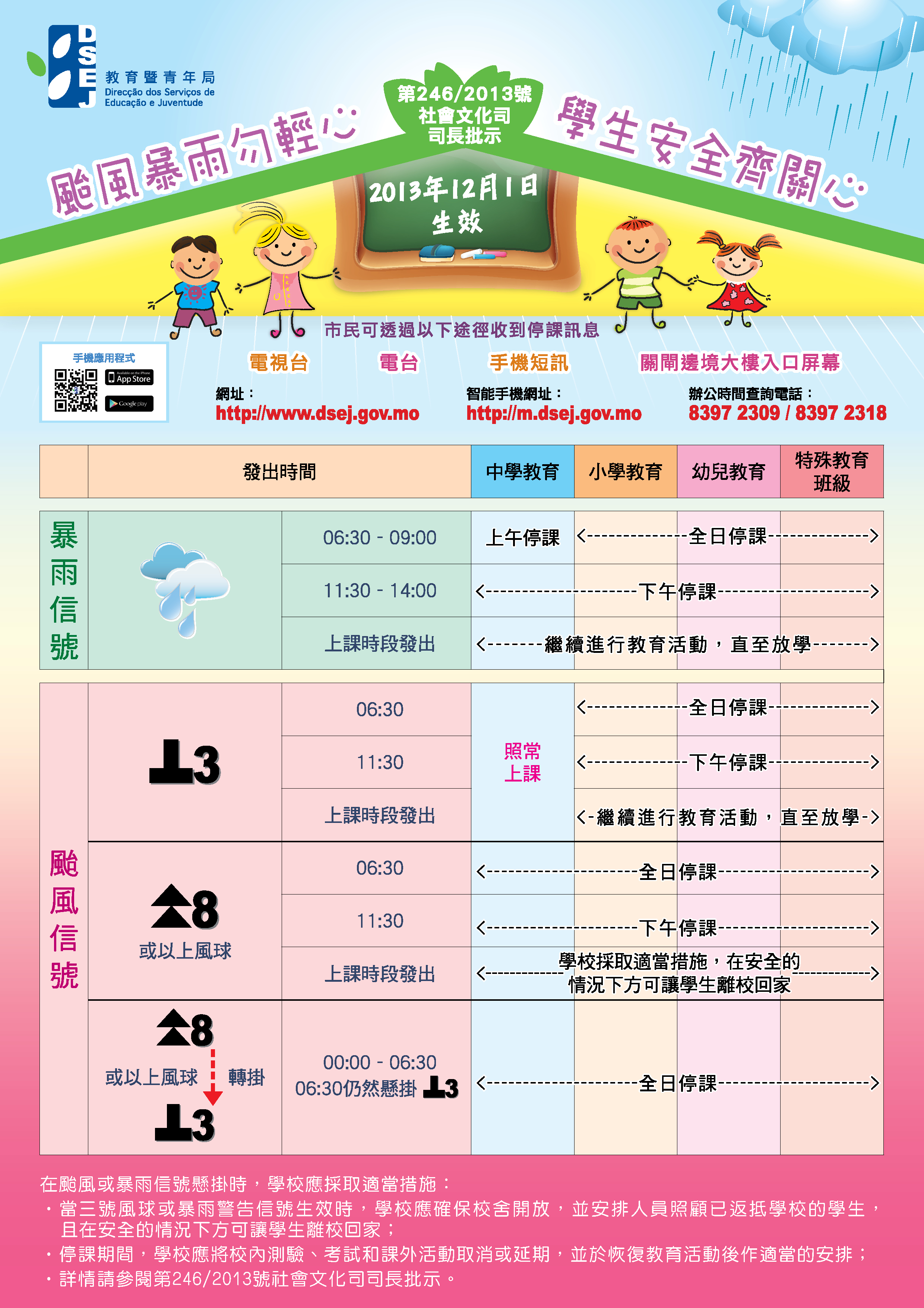 根據246/2013號社會文化司司長批示核准的《學校在熱帶氣旋及暴雨情況下所採取的措施》,有關規定將於本年十二月一日起生效。批示中主要有兩項改變:第一,停課訊息的發佈時間提前半小時,即在上午六時三十分及十一時三十分;第二,當有暴雨訊號或三號風球,幼兒、小學及特殊教育班級全日停課。此外,該批示亦要求學校須制定惡劣天氣下的應變措施,並加強與家長的聯繫,及時向學生作妥善安排。