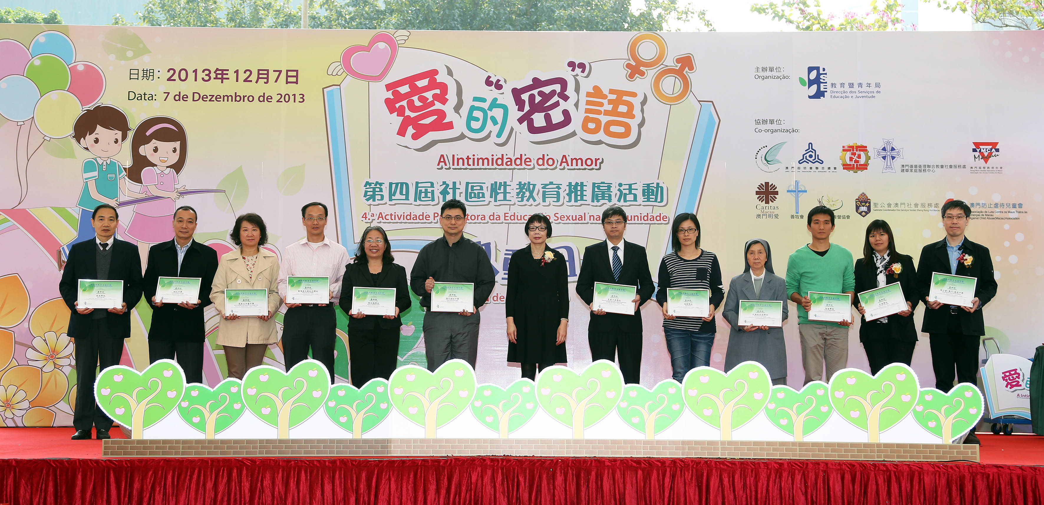 “愛的‘密’語──第四屆社區性教育推廣活動”於十二月七日下午在友誼廣場舉行了啟動日,為是次為期三個月的性教育推廣活動揭開了序幕。教青局副局長郭小麗、教育廳廳長梁慧琪及各個協辦單位代表主持啟動儀式,寓意政府和社會服務團體齊心合力,把“健康親密關係”的訊息推廣至社區,共同培育下一代茁壯成長。活動現場還有一系列的精彩節目,包括歌手演唱、魔術表演、管樂表演、流行舞、互動遊戲、有獎問答及攤位遊戲等,並舉行“學校性教育支援計劃”嘉許儀式。教青局向參與計劃的學校頒發嘉許狀,感謝學校的支持,肯定學校對性教育工作所做的努力。獲嘉許的部分學校代表更即場分享參與計劃的心得,認為有關計劃對學校在性教育規劃、學生學習及教學人員的專業成長等方面均有所裨益。