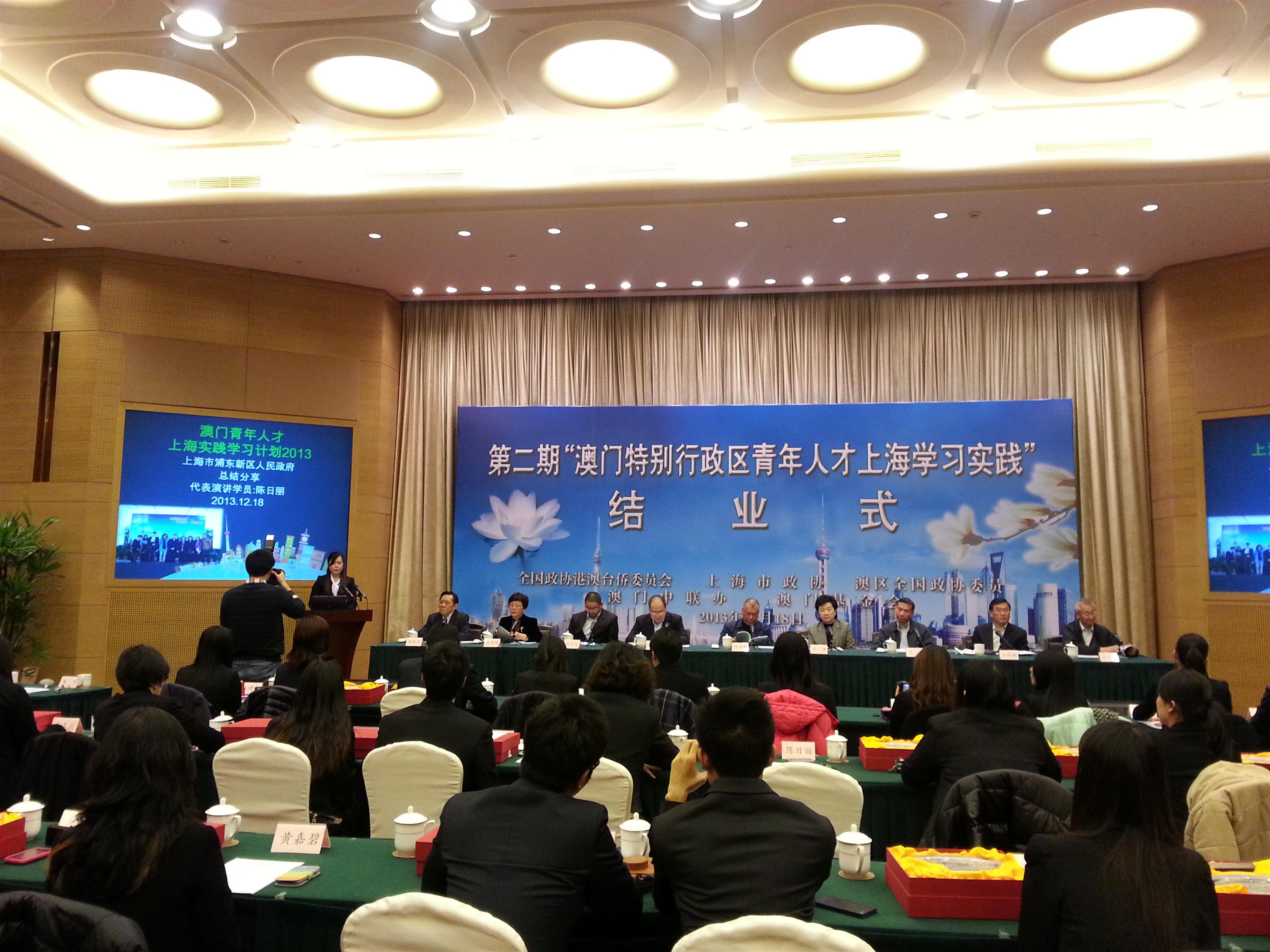 2013“澳門青年人才上海學習實踐計劃”昨日(12月18日)舉行結業式,全國政協副主席何厚鏵,上海市政協副主席姜樑,全國政協港澳台僑委員會副主任華建,中聯辦協調部部長許爽,澳門基金會行政委員會主席吳志良、副主席林金城、委員黎振強等出席了儀式。主辦單位寄語學員認真總結參加學習實踐活動的收穫,回澳後在每一個崗位上,都能夠繼續以年青人該有精神面貌,為建設澳門特區作出應有的承擔。