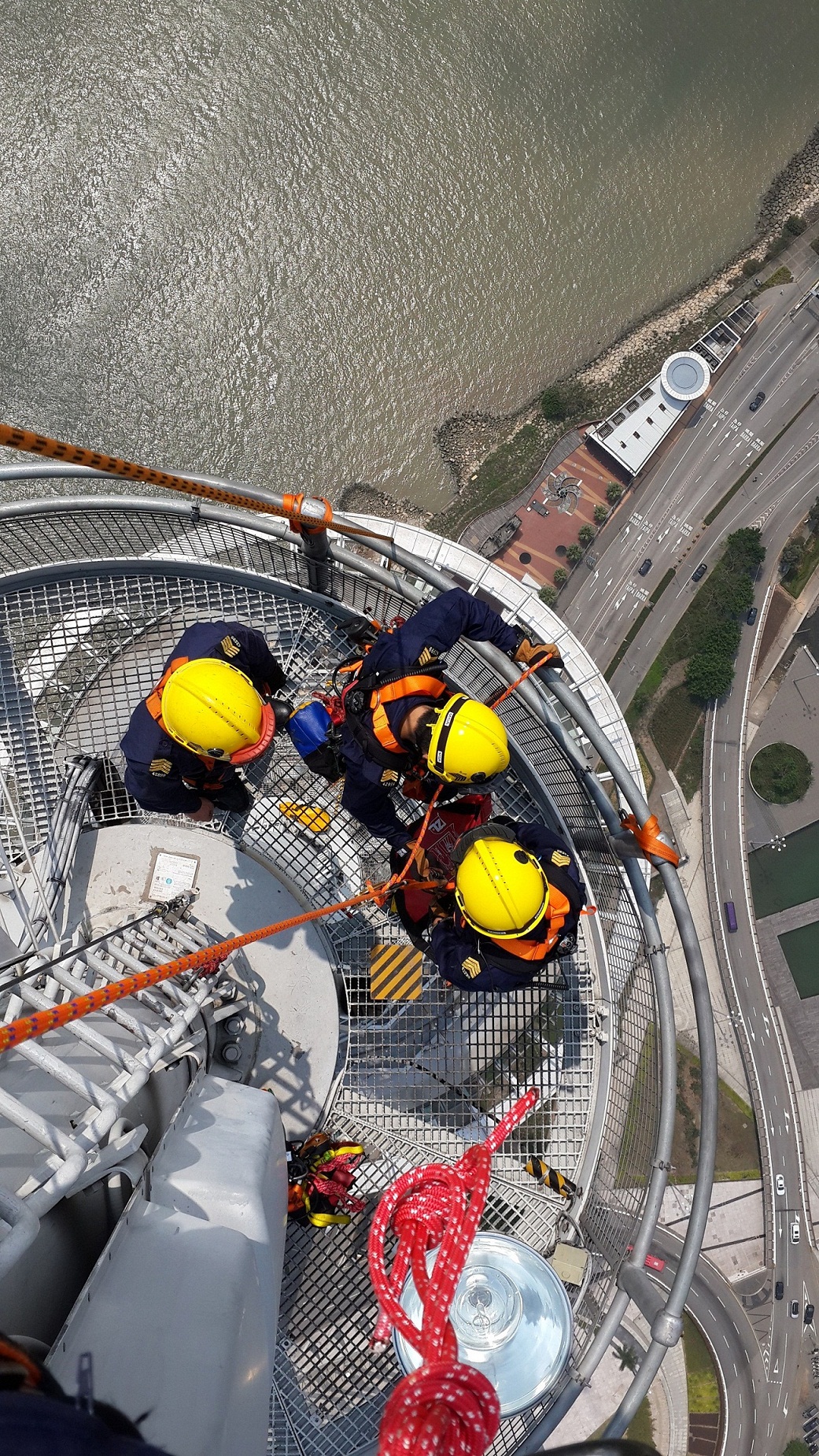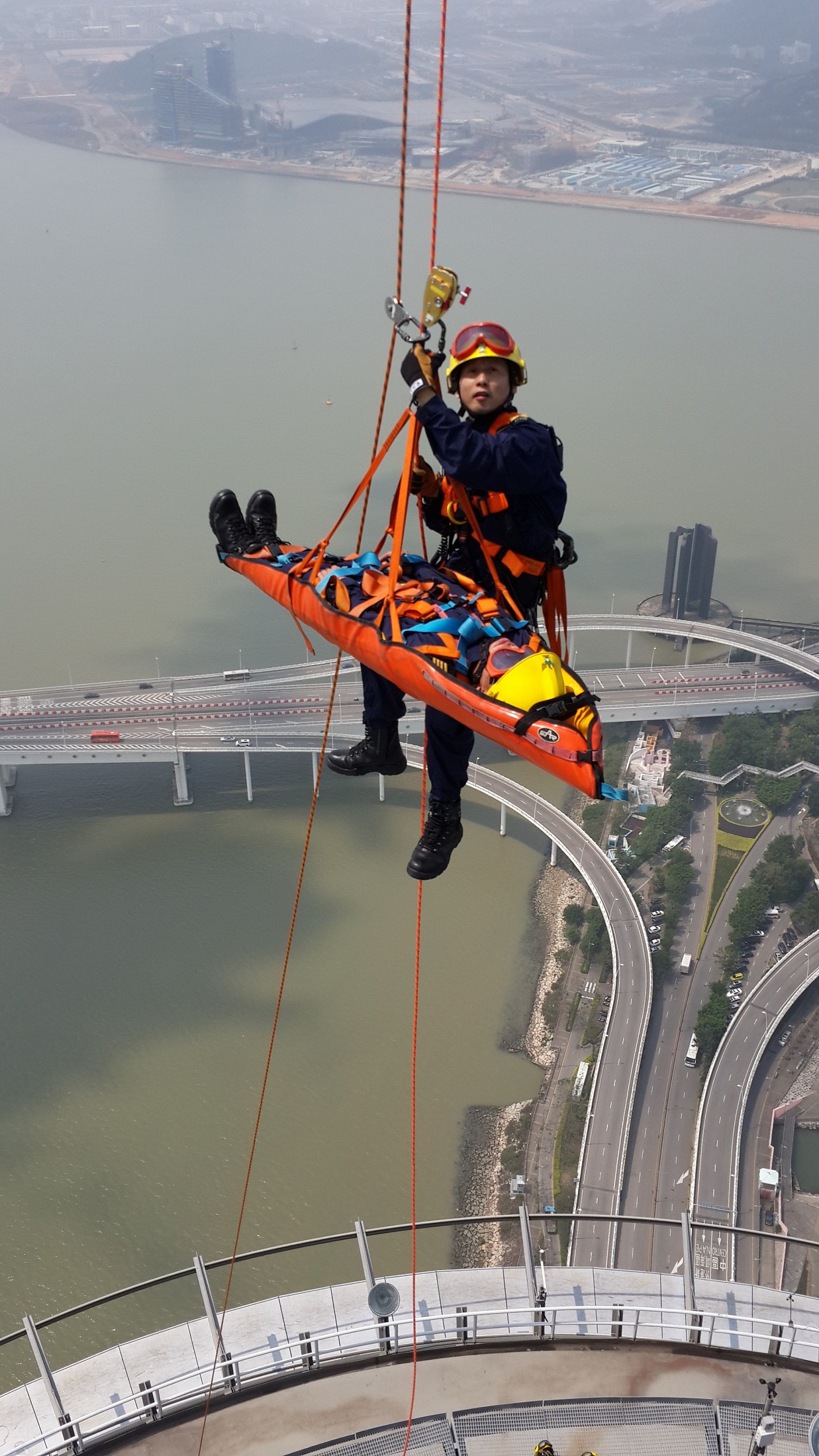 聯合操練是在旅遊塔T64層至T88層室內及室外區域進行,內容模擬有遊客在T88層室外參與攀登期間,因身體不適且不能自行返回室內,而被迫停留在攀登鐵架上。消防局接報後,派出高空拯救車輛展開拯救工作,高空拯救隊員在旅遊塔職員引領下到達遊客停留的攀登鐵架,隊員首先利用拯救工具將遊客固定,再將其降落至安全地方及移至T64層的室內。在連續2日的操練中,消防局充分利用不同的高空拯救工具,及不同的方法進行拯救操練,過程順利且達到預期效果,相信通過聯合操練,加強了消防局及旅遊塔雙方的應變及協調能力,能更有效地保障市民及遊客的安全。
