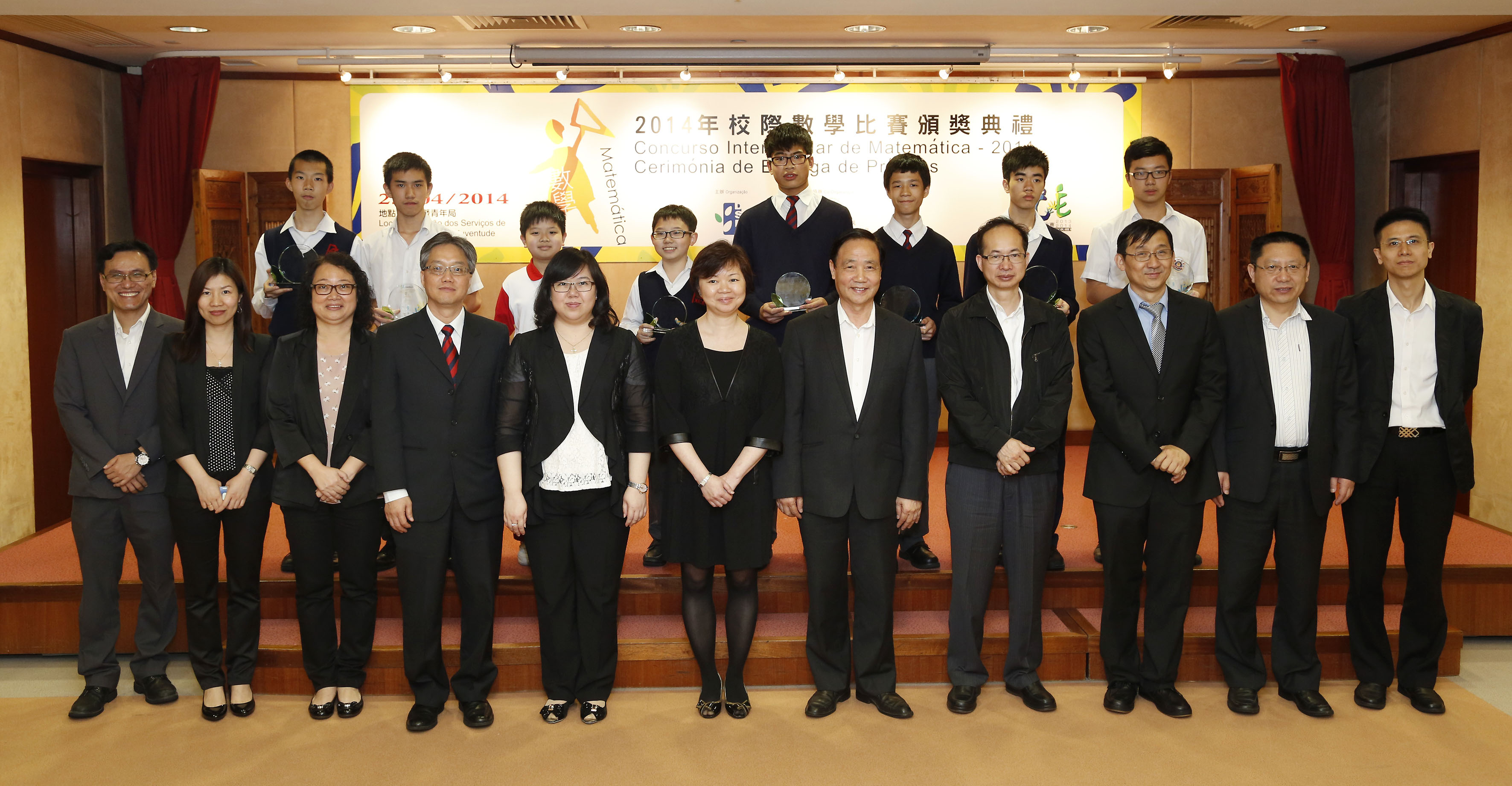 由教育暨青年局主辦、澳門大學科技學院協辦的“2014年校際數學比賽”(小學組、初中組及高中組)已於日前順利完成。為表揚得獎學生,教青局已於4月25日下午五時正在一樓仲尼堂舉行頒獎典禮,出席的嘉賓包括教青局多名主管、澳門大學科技學院助理教授梁應德、以及多所中、小學學校校長。主、協辦單位期望透過是項比賽,鼓勵學生研習數學,提升本澳數學水平,同時促進校際間的學術交流,並藉此甄選獲獎學生代表澳門出外參加地區性、全國性及國際性的數學比賽。