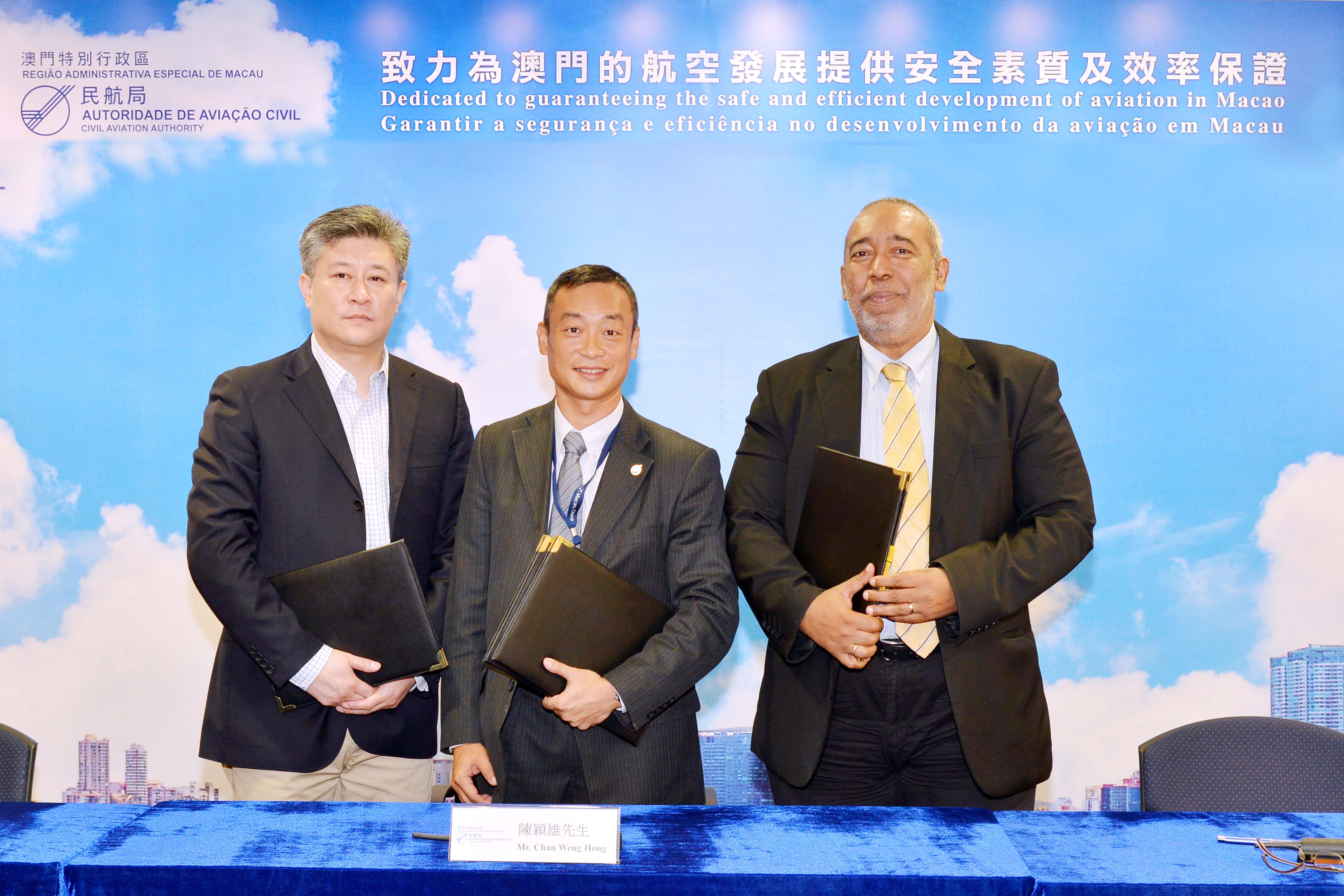 簽署儀式於今早十一時半在民航局辦事處舉行,三方簽署代表為民航局局長陳穎雄先生、澳門航空有限公司執行董事兼總經理朱松岩先生和機場管理有限公司機場總監包祿仕先生。