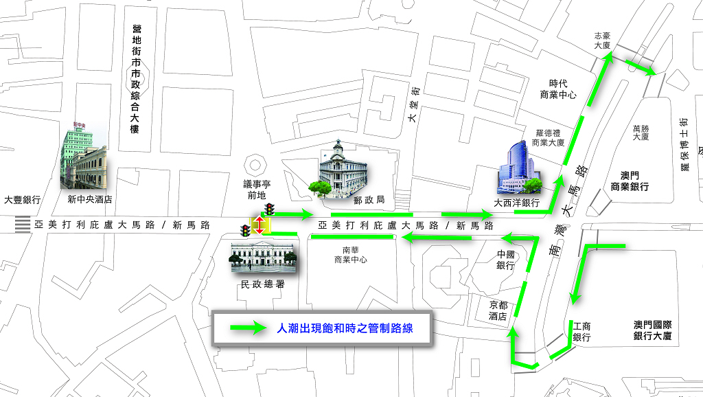 中區方面,在新馬路議事亭前地路段、新馬路與殷皇子馬路交界、南灣大馬路部份路段,因應情況在人潮飽和時,會實行人流管制措施。重點安排是新馬路靠郵政局及民政總署之南北兩側行人路,將實施單向通行,離開議事亭前地的人潮,只能往葡京方向行進,在抵達大西洋銀行十字路口時必須左轉入南灣大馬路,在匯豐銀行附近可分流或橫過南灣大馬路到對面行人路(近翠園酒家)後散去。另一方面,在殷皇子近南灣大馬路一端的人流若想進入新馬路,須單向往南行至國際銀行旁邊的紅綠燈位,橫過南灣大馬路至舊法院門口,然後經過京都酒店、中國銀行後左轉,進入新馬路南側行人路往民政總署方向單向行走。