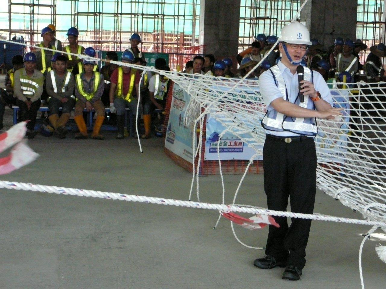 此外,為使施工人員了解高空工作的危害,以及人體下墮背後的危險性與其造成的衝擊力,講座特設體驗式實習環節,安排施工人員緊握預先準備好的安全網,再將模擬真人大小和重量的假人從高處掉下,讓施工人員親身體驗使用了防墮裝備前後的差別,並同時感受假人下墮時所產生的衝擊力。透過這高空體驗式實習,可以令施工人員對高空工作危害有深刻的親身體會,從而令施工人員時刻遵守高空工作的安全規定,能自發性地使用合適的工作平台與相應的個人防護措施。勞工事務局局長黃志雄於講座期間與工程承造商的安全管理人員及前線工友進行交流,並呼籲承造商切實做好工地安全管理,以保障工作人員的安全健康。