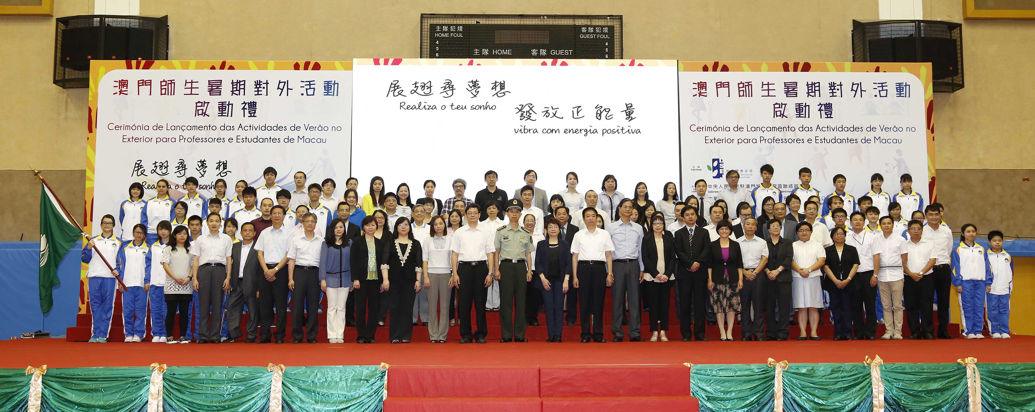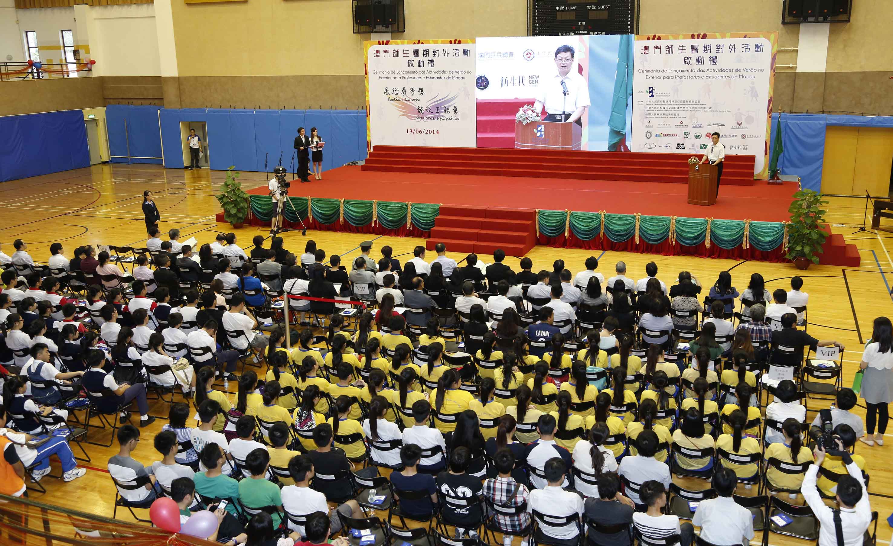 “澳門師生暑期對外活動啟動禮"於6月13日下午在中葡職業技術學校體育館舉行。教育暨青年局局長梁勵、中央人民政府駐澳門特別行政區聯絡辦公室文化教育部部長劉曉航、中國人民解放軍駐澳門部隊後勤部部長李輝忠大校、社會文化司辦公室惠程勇顧問、教育暨青年局副局長老柏生、教育暨青年局副局長郭小麗、非高等教育委員會委員、青年事務委員會委員、教學人員專業委員會委員、合作機構代表、各校校長及各代表團約1,000多名師生出席了有關活動。