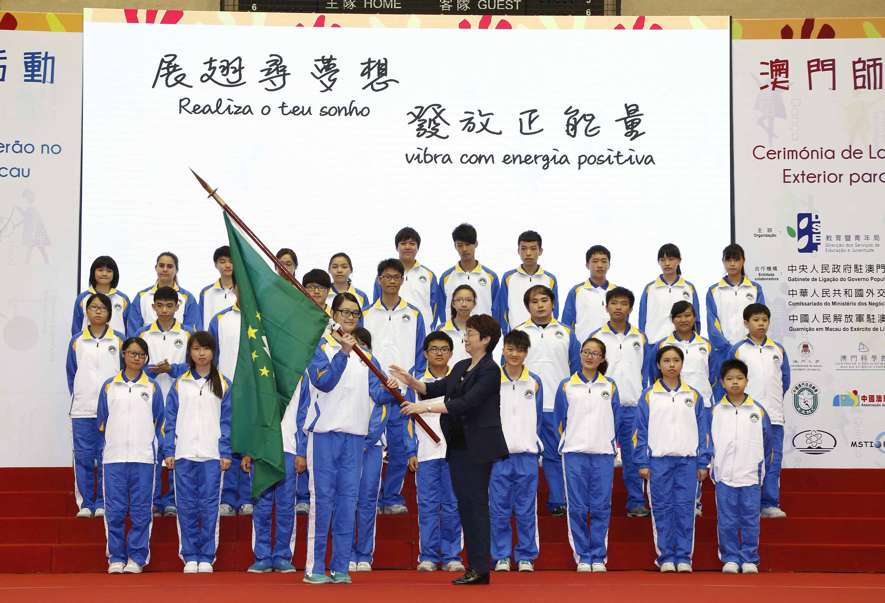 師生代表從總團長梁勵手中接過澳門特區區旗,寓意全體師生準備就緒,將代表澳門特區前往不同地方進行交流學習,並把學到的知識運用於未來社會發展。老柏生在致辭中勉勵各代表團的師生們透過參與不同性質的活動,吸取更多人生經驗,増廣見聞,加強自身的競爭力,建立更廣闊的人際網絡。現場播放了學生過往參賽和交流活動的片段,並請教師及學生代表上台分享去年活動的花絮及經歷和今年準備出發前的心情及展望;教業中學及聖家小學歌詠團表演了精彩的節目;中葡職業技術學校派出義工協助各項工作,使活動得以順利進行。