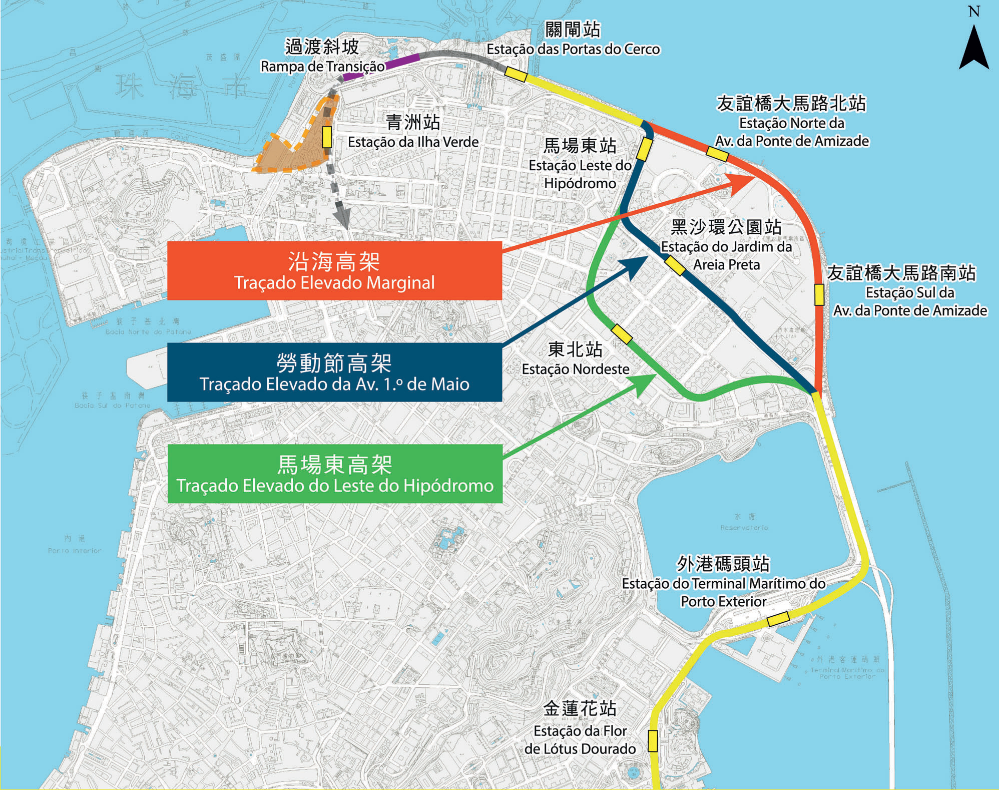 輕軌澳門半島線北段始於金蓮花站以北,連接本澳高密度的住宅區──東北區,至關閘站為止。顧問技術團隊結合城巿及社會發展所需,提出三個建議走線方案,均設有4個車站。各方案均始於金蓮花站以北,經友誼大馬路連接外港碼頭站,再沿水塘東側而行;行經水塘北角後,三個走線方案分別經不同路線連接東北區及關閘站。
