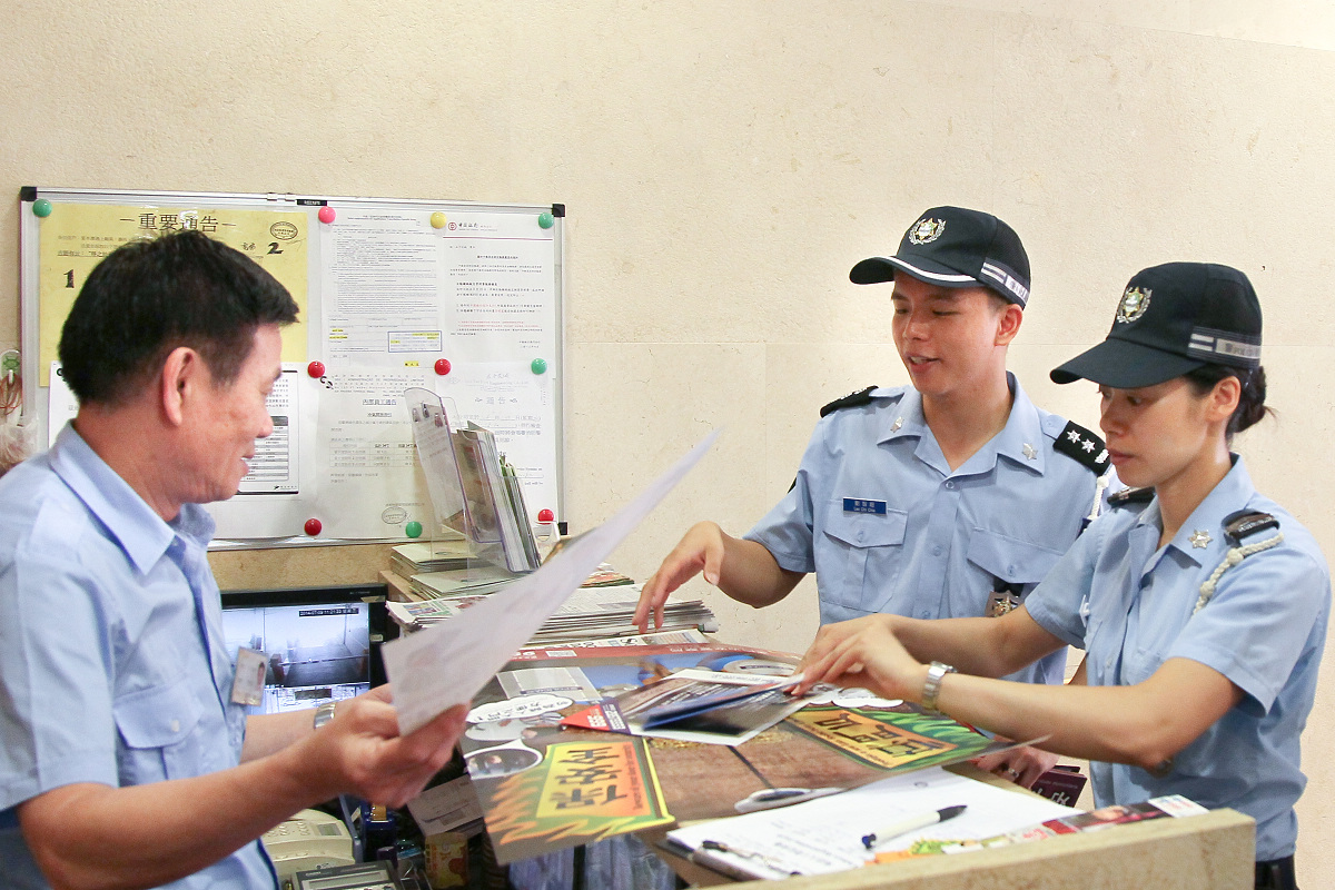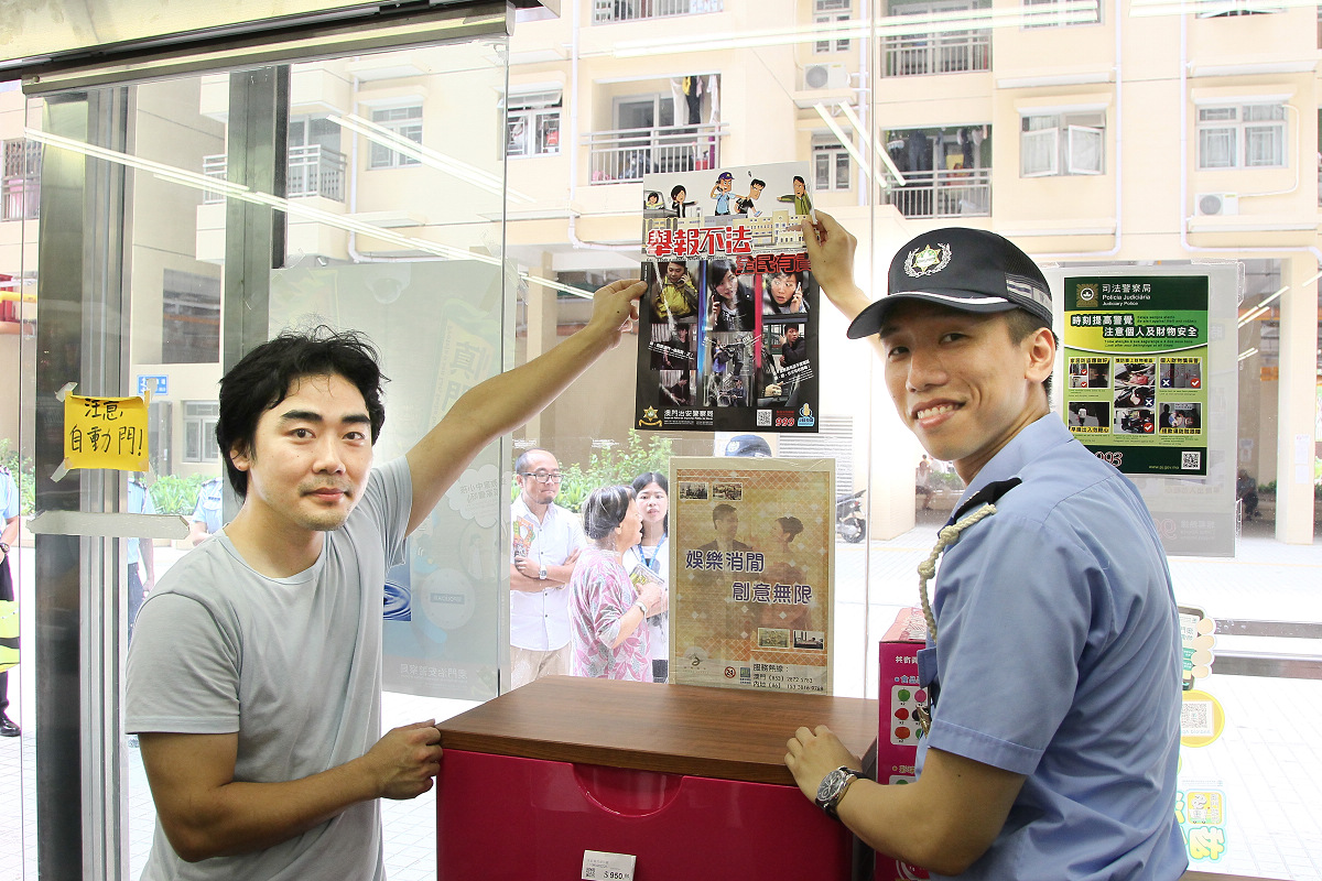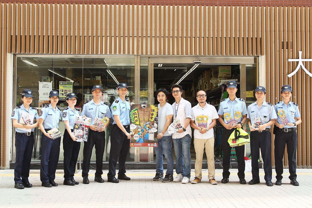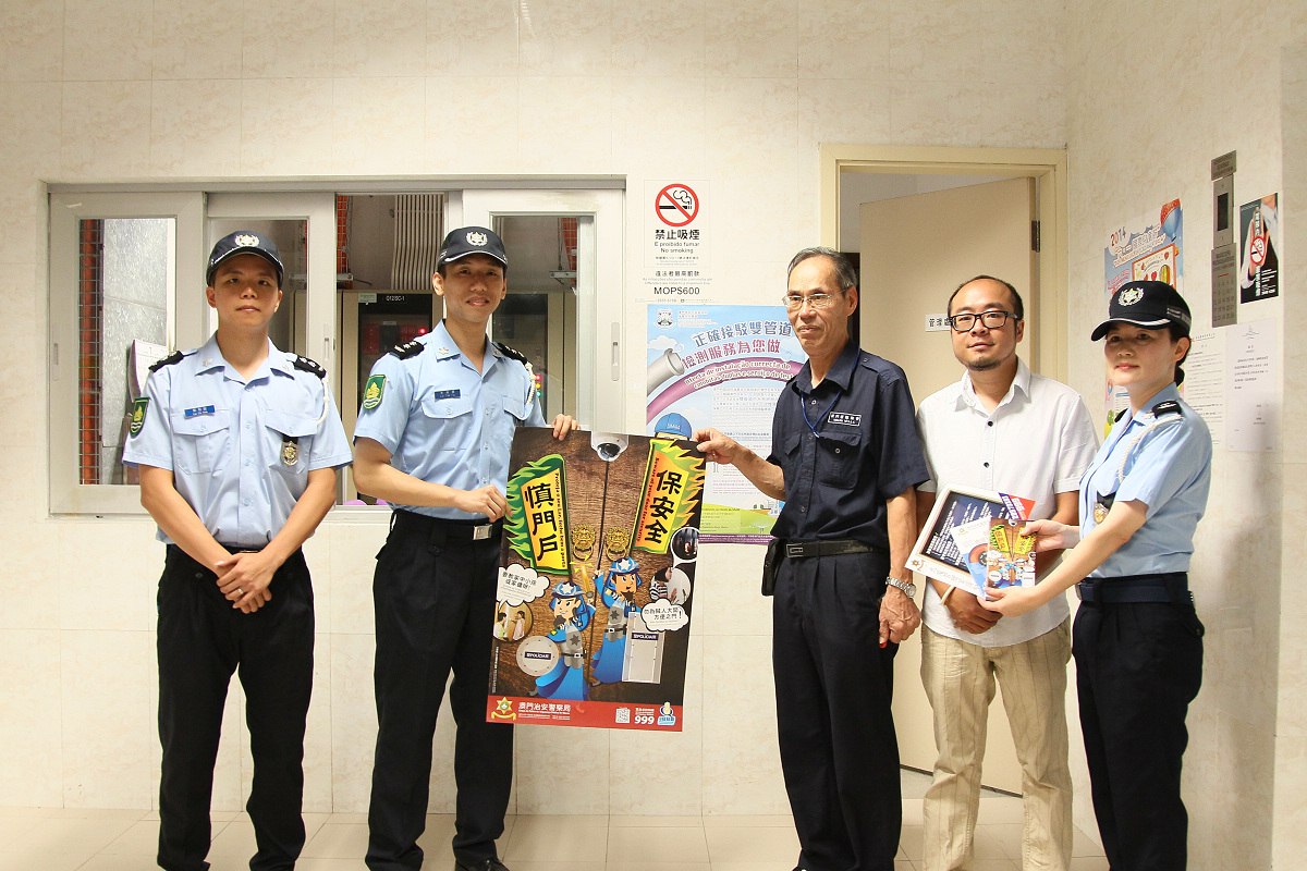 今天上午,本局海島警務廳副警司李德輝、劉智超連同公關處警長温少蓮一行9人及街總離島代表鄭煜、黃雪儀、呂偉良主任等共5人組成宣傳小隊,前往石排灣經屋及氹仔花城公園一帶之大厦管理處進行家居安全及商舖防竊活動,向大厦管理員、居民及附近之商舖派發“慎門戶、保安全”、“舉報不法”之海報及宣傳小冊子,向其加強及提醒防盜意識,尤其在外出旅遊期間,市民應將門戶鎖好,管理員則應多加巡查大厦之樓層單位,做好保安工作。活動期間,受到市民歡迎,主動問及防盜資訊。