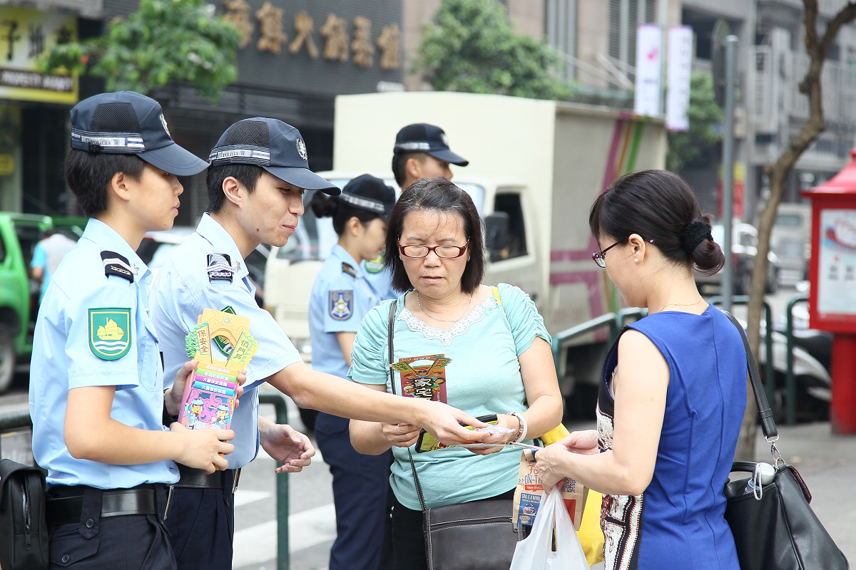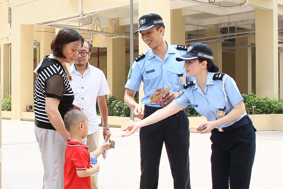 暑假將至,預計市民會外出旅遊,同時,吸引旅客訪澳,市面人流暢旺,竊匪會伺機作案。為此,今天本局派出宣傳隊聯同街坊總會離島代表到路環石排灣經屋及花城公園一帶進行防罪宣傳活動。