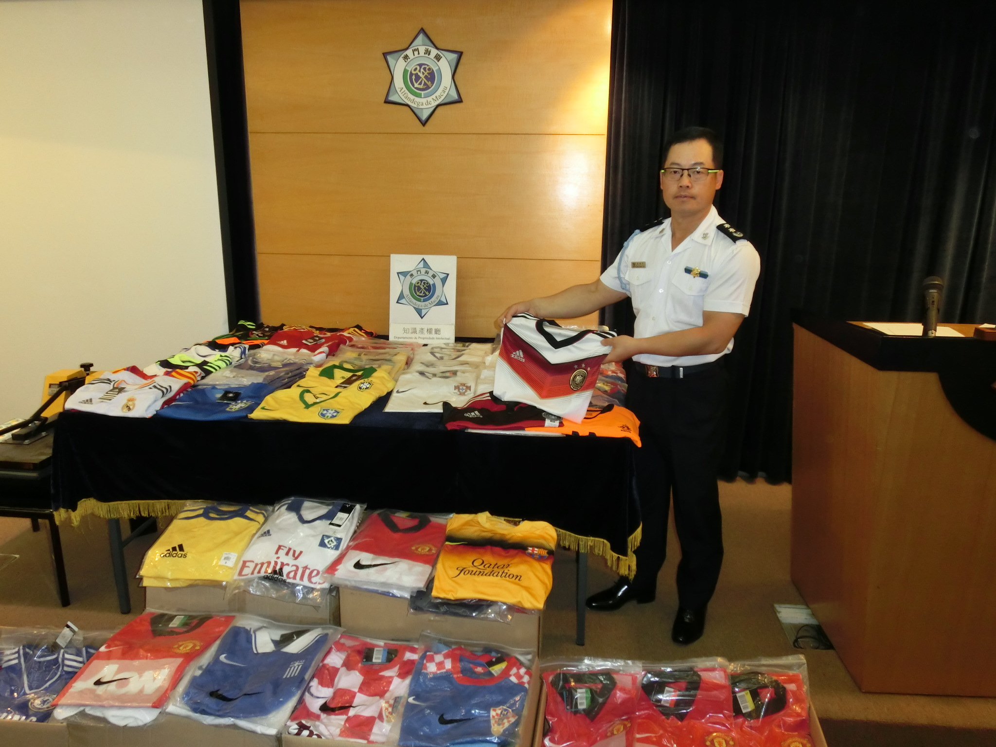 海關知識產權廳根據舉報資料及情報分析,由反互聯網侵權偵查小組在網上巡查發現,不法份子在網上社交媒體中宣傳和販賣,張貼不同國家的熱門球衣招徠潛在顧客,並發現該實體店舖曾遷往其他地方繼續經營,改用新的店舖名稱,以經營佛牌作為掩飾,主要以售賣熱門國家足球隊球衣及替顧客在球衣上燙印徽章為主,視乎顧客的需要,燙印的內容包括世界盃入圍國家隊及歐洲熱門足球隊隊徽、著名球星的名字、字母及號碼等等。因為在世界盃效應下,球迷都想擁有心儀國家隊或球星的球衣以示支持,有人覬覦商機無限的世界盃效應,甘冒刑責之風險而售賣侵權產品的球衣。由於該等懷疑假冒球衣的質料粗劣,而且價格較正牌球衣便宜一半,經相關品牌權利人代表的協助鑑定,證實其中大部份為假冒貨品。海關偵查人員在店舖內查獲懷疑假冒品牌的球衣包括有「Adidas」、「Nike」及「Puma」合共二百九十七件、世界盃入圍國家隊隊徽、歐洲知名球隊隊徽、2014世界盃徽章「Fédération Internationale de Football Association (FIFA)」一批及燙印機一部,該批懷疑侵權的產品若以正價發售,價值超過澳門元十八萬元。上述品牌球衣經核實,其品牌已在澳門特區政府經濟局作出合法註冊登記,而經有關品牌權利人代表初步鑑定,該批球衣大部份為假冒産品。