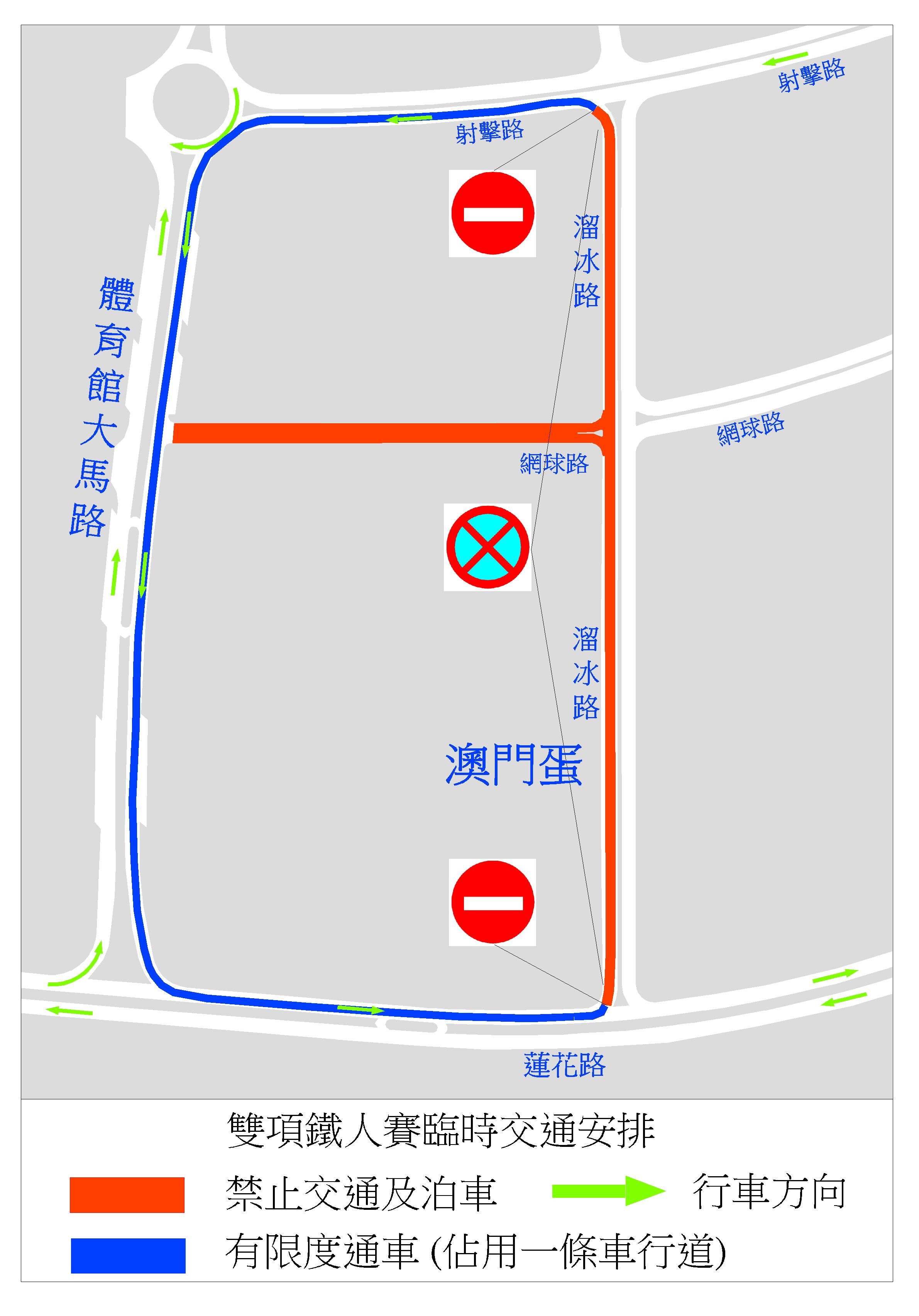 體育發展局將於本月13日(周日)舉行鐵人賽,因應賽事需要,介乎蓮花路與射擊路之間一段靠向澳門東亞運動會體育館一側的溜冰路,即蓮花路往射擊路方向路段,以及介乎體育館大馬路與溜冰路之間一段網球路於當日上午7時30分至10時30分封閉交通。同時,體育館大馬路、蓮花路及射擊路則實施有限度通車。