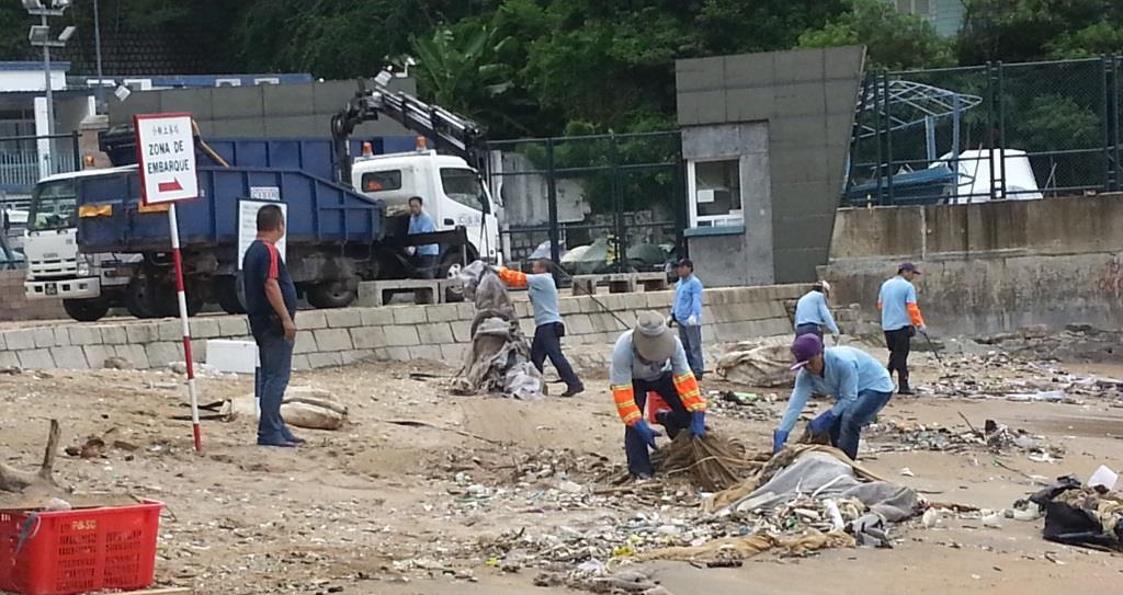 由於颱風關係,黑沙及竹灣泳灘的垃圾有所增加,為儘快恢復海上環境衛生,海事及水務局聯同清潔專營公司加強清理海面及泳灘的垃圾。