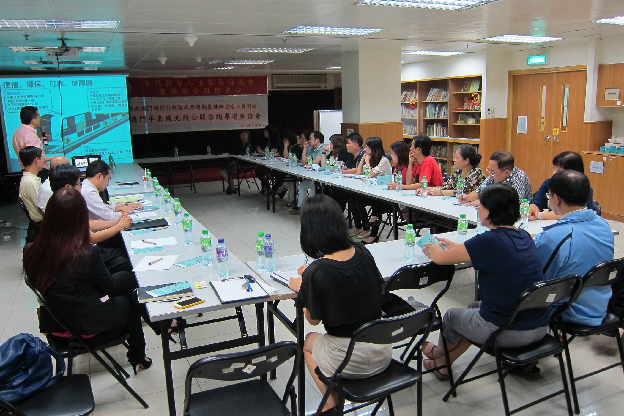運輸基建辦公室日前聯同土地工務運輸局、交通事務局及環境保護局的代表,拜訪包括澳門弱智人士服務協會、澳門弱智人士家長協進會、利民會及善明會等多個團體,並於7月25日舉行復康及社福團體專場座談會。運建辦期望透過活動,就輕軌北段走線的三個方案,聽取不同界別人士對於公交出行的需要。