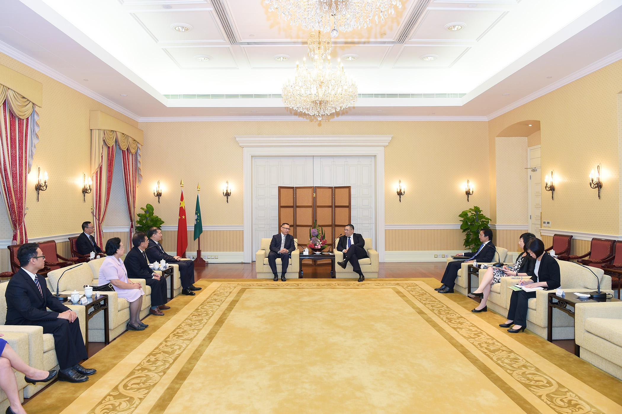 行政長官崔世安今(5)日在政府總部會見澳門公務專業人員協會會員大會主席陶永強及理事長官世海一行,就未來公務員制度改革,以及公務員薪酬調整執行情況等交換意見。