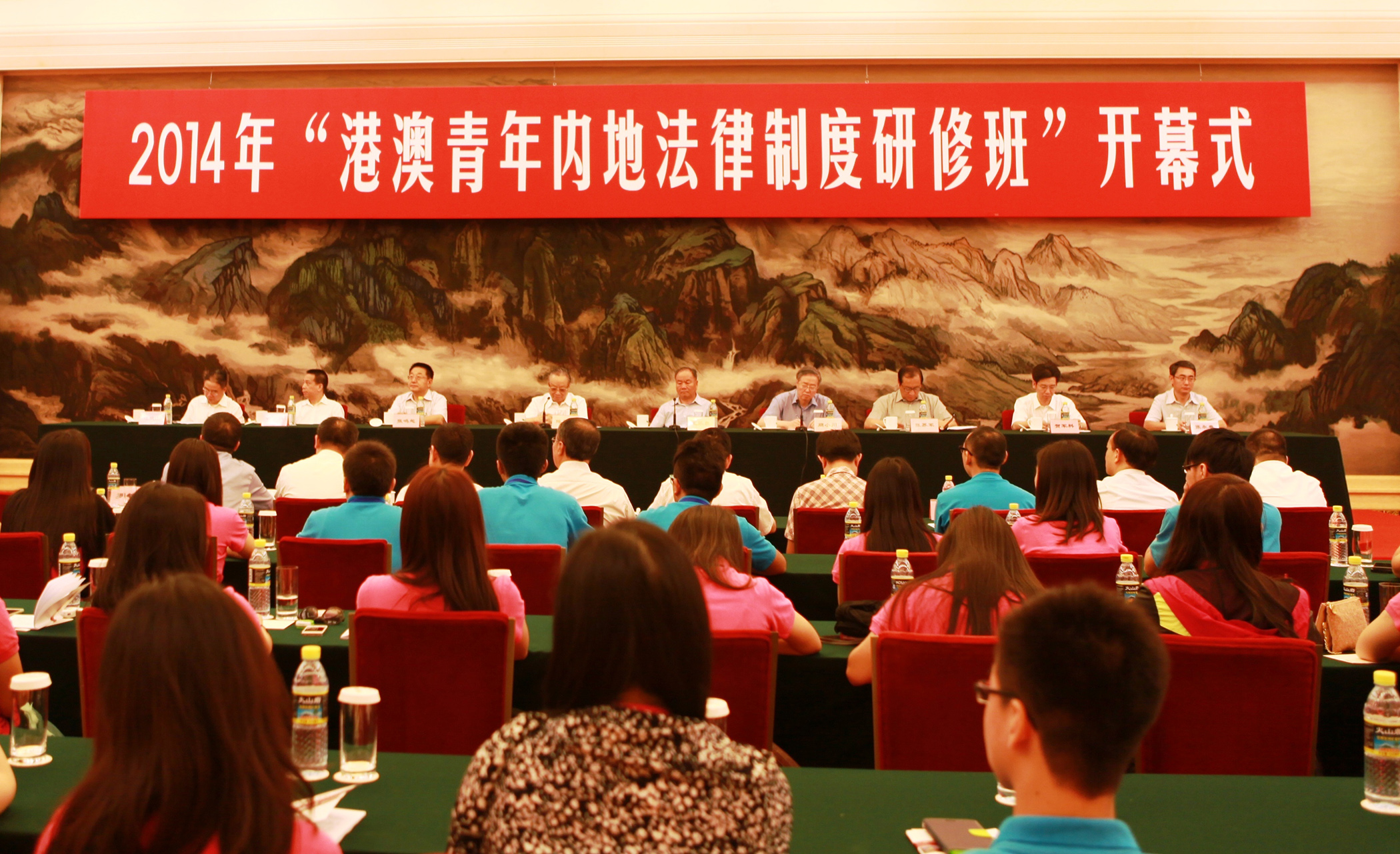 “2014年港澳青年內地法律制度研修班”由中國法學會及共青團中央共同主辦,司法部及教育部協辦,並由澳門法務局組織本澳的優秀法律學生參與,目的加強港澳青年對內地法制的認識及瞭解,其意義及影響深遠。為重視活動並對研修班的支持,全國政協副主席、中國人民銀行行長周小川出席了在人民大會堂舉行的開班儀式並發表講話,鼓勵同學們多認識祖國多瞭解祖國的發展,出席的還有中國法學會會長王樂泉,以及司法部和教育部的領導,法務局局長張永春率領澳門團出席,澳門代表團還包括法務局法律推廣廳廳長羅靜萍、澳門大學法學院中文法學士學位課程主任邱庭彪副教授、澳門科技大學法學院趙琳琳副教授、兩所大學的優秀法律學生以及法務局普法動力義工等合共五十五人。
