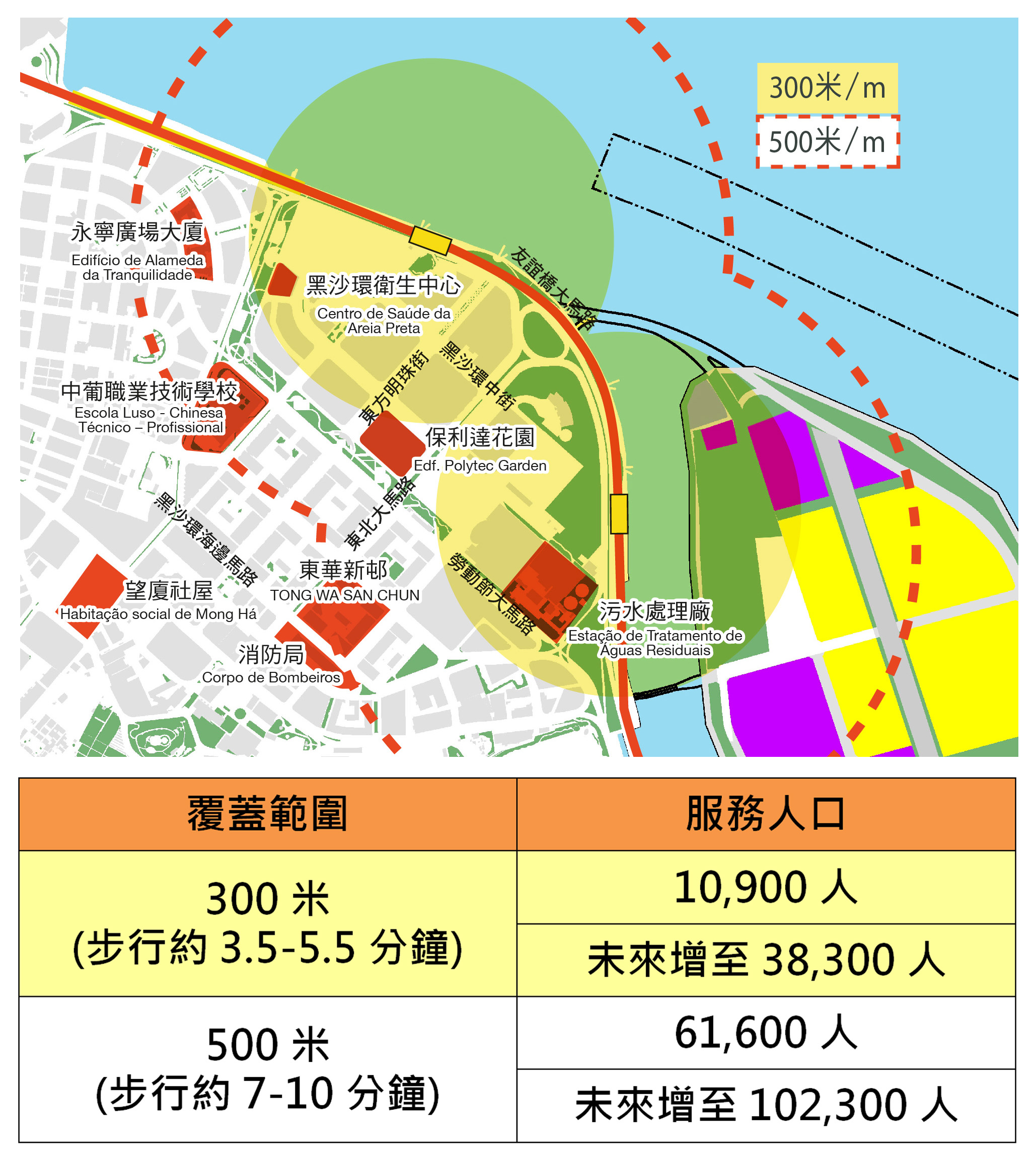 沿海高架走線的站點離東北主要住宅區的中心群較遠,與新城填海A區又因水道所隔,難以有效覆蓋,因此,站點的服務範圍較不理想。雖然東北沿海和黑沙環公園一帶的住宅可於5至10分鐘內步行至輕軌站點,但從廣華新邨一帶的公屋群及祐漢區的住宅前往車站的平均步行時間都超過10分鐘。此外,由於沿走線海濱而建,車站人流僅可作單邊集散,而道路環境及交通條件亦不利設置巴士站作轉乘,未來亦需透過架設其他接駁設施,如行人天橋等,優化乘客的過路條件。