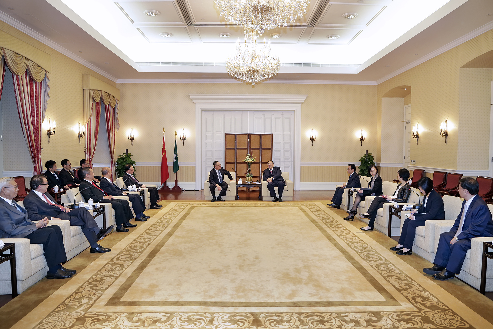 澳門日報讀者公益基金會副會長陸波、陳少雄、飛安達及吳柱邦,理事長黃國勝,以及行政長官辦公室主任譚俊榮、行政會秘書長柯嵐參加會面。