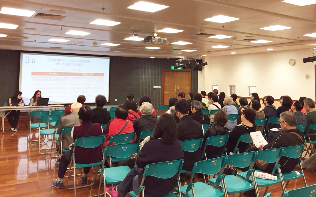 房屋局先講解《樓宇維修基金》綜合計劃,隨後解答市民的樓宇管理問題,以此鼓勵及推動業主履行樓宇維修責任。會上,有市民查詢“樓宇維修資助計劃”之申請內容,停車場外牆維修工程、清拆大廈的裝飾柱工程能否申請?而大廈有業主會及管理委員會,應以那一種身份提出申請?房屋局表示,“樓宇維修資助計劃”獲資助範圍為樓宇共同部分進行的工程,包括保養或維護樓宇結構、保養或維修樓宇內外牆飾面、維修共同設施、拆除僭建物、保養或維修斜坡或擋土牆;申請須透過召開分層所有人大會議決通過進行相關工程,並授權依法成立的管理委員會主席代表全體業主向房屋局遞交。