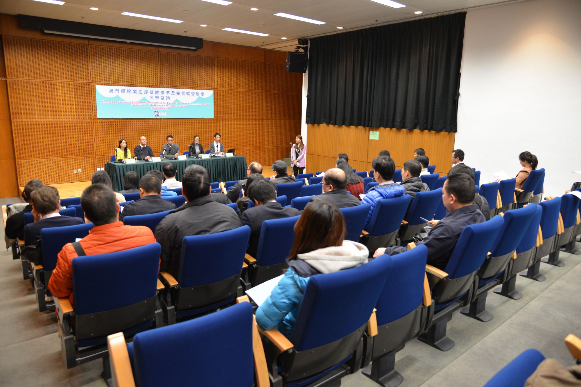 環境保護局由2014年12月17日起開展《澳門餐飲業油煙排放標準及完善監管制度》的諮詢工作,並於今日(2015年1月11日)假澳門藝術博物館演講廳舉辦面向社會團體和居民的公眾諮詢會,藉此介紹諮詢文本的內容,進一步收集社會的意見和建議。