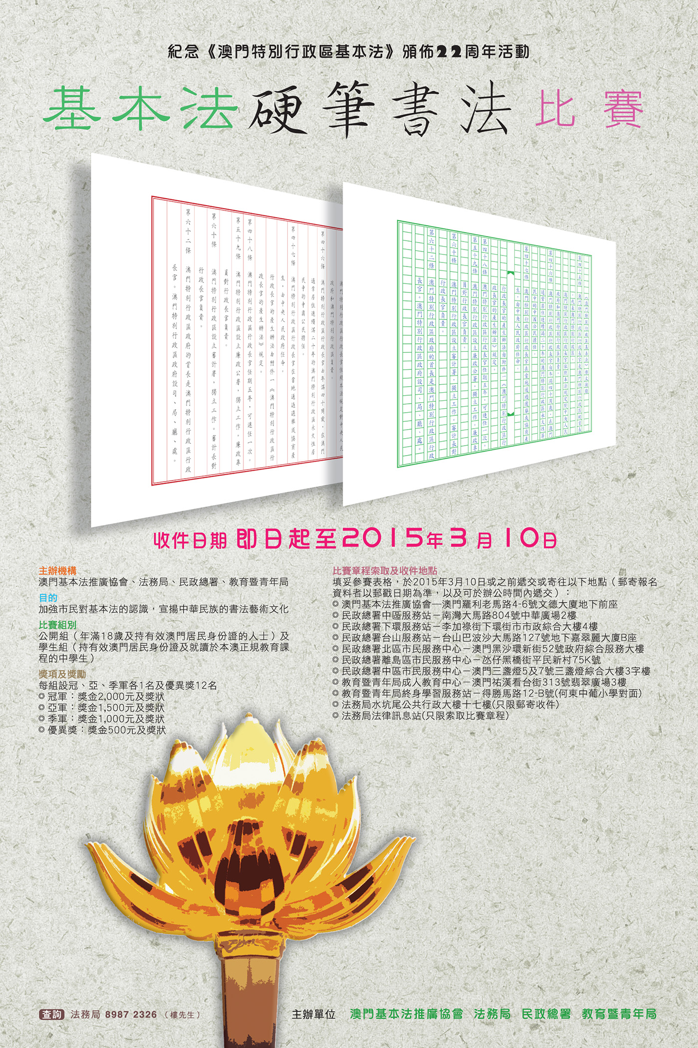 為紀念《澳門特別行政區基本法》頒佈二十二周年,澳門基本法推廣協會、法務局、民政總署和教育暨青年局共同舉辦一系列活動及比賽,而當中的基本法硬筆書法比賽現已開始收件,有興趣參賽的市民,請於三月十日前遞交作品。