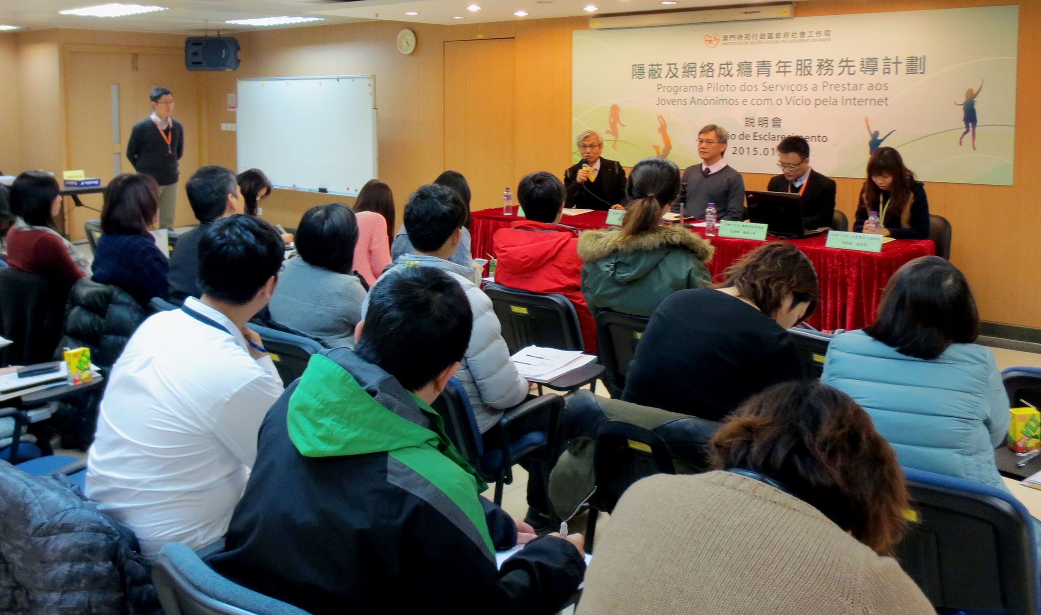 為讓符合資格的社會服務機構進一步了解先導計劃的詳細內容,社會工作局在2015年1月15日於復康服務綜合評估中心會議室舉行了《隱蔽及網絡成癮青年服務先導計劃》說明會。社會工作局社會互助廳蔡兆源廳長、機構津助管理組張景輝職務主管、兒童暨青年服務處胡嘉敏技術員,以及香港城市大學應用社會科學系主任盧鐵榮教授,向在場的20名分別從事兒童、青少年、家庭、社區及防治藥物濫用服務的社會服務機構負責人及代表介紹本計劃的詳情,並回答與會人士有關服務形式、服務對象及營運津助等提問。社會工作局把會上的提問及回應資料匯編成問題集,上載至社會工作局網頁www.ias.gov.mo,供各社會服務機構及市民查閱。倘有任何查詢,請於公共行政當局辦公時間內致電83997791或83997737與胡小姐或黎先生聯絡。