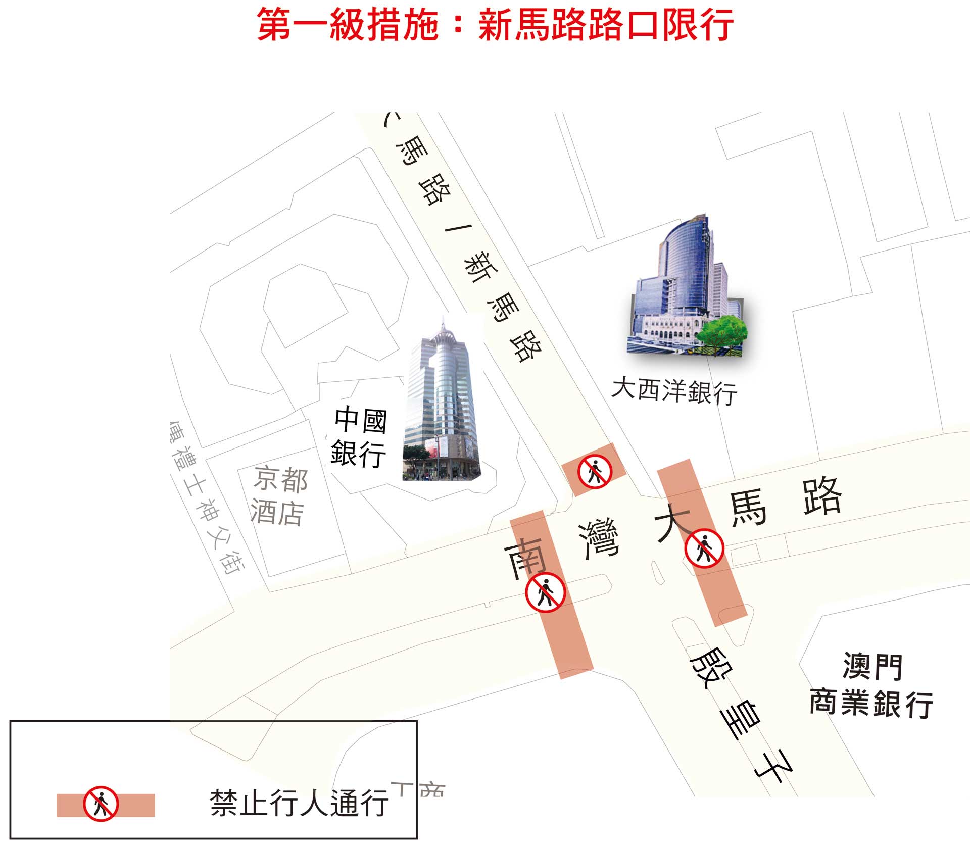 當第一級措施未能解決人群持續擠擁問題時,在第一級的基礎上,新馬路將實施單向人潮管制。行人需遵照附圖所示‘倒T’字型單向行進路線前往議事亭前地、大西洋銀行、滙豐銀行、商業銀行、工商銀行、中國銀行及民政總署等地點。