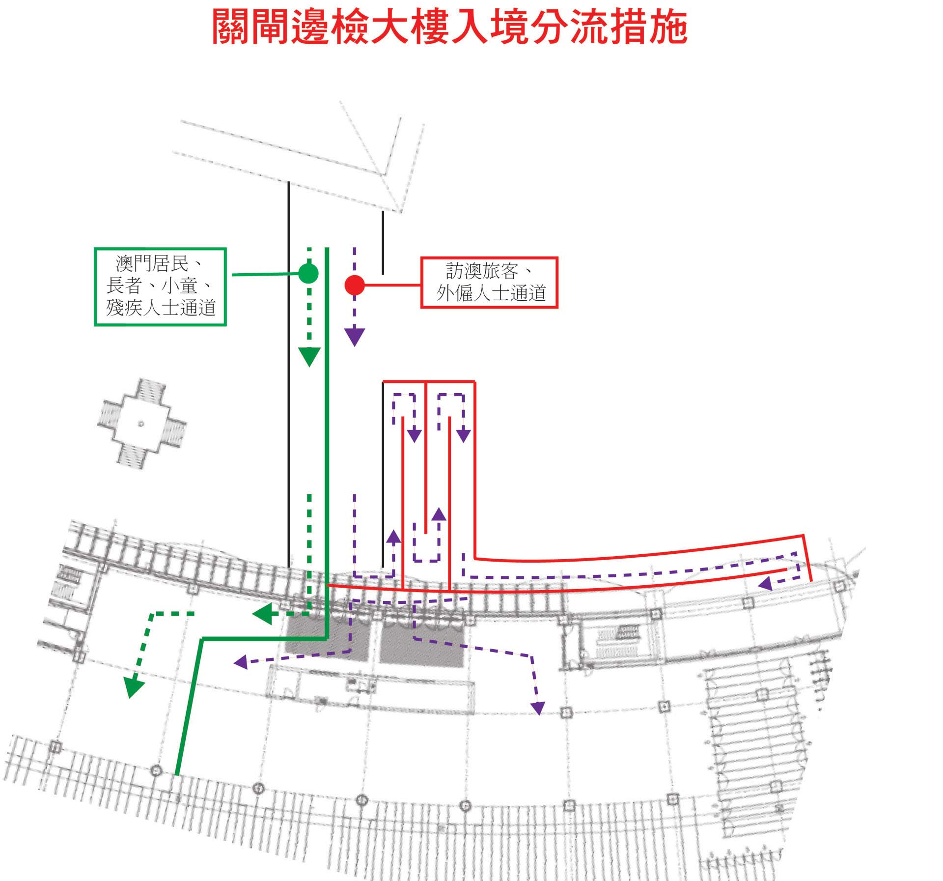 出境人潮管制措施:當離境大堂接近飽和時,關閘廣場風雨廊路段,會實施“分流及分段放行”的措施,臨時封閉該走廊兩邊,在特定位置設立出入口。澳門居民、六十五歲或以上長者、孕婦、傷殘人士和三歲及以下小童,將被安排使用其中一條專用隊列,而其餘旅客包括外僱人士則使用另一隊列。