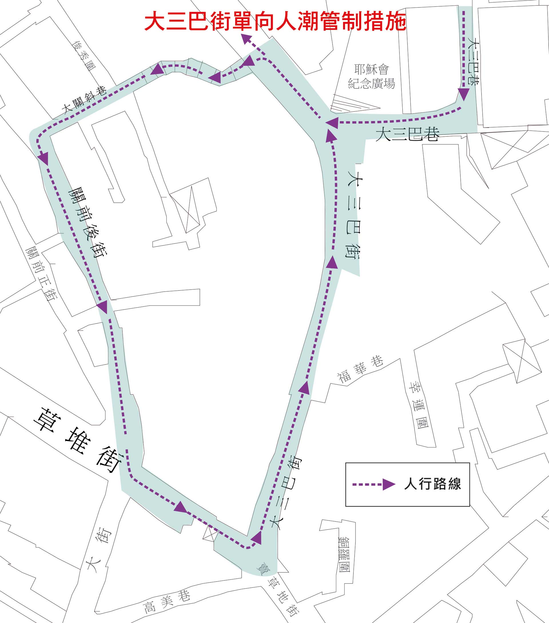 當大三巴街(手信街)人群出現擠擁時,將會實施單向人潮管制措施,人流只可單向上行往牌坊,並取道周邊的街巷如大關斜巷、關前後街、高園街等離開。