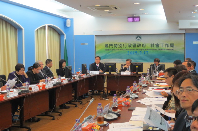 “澳門養老保障機制跨部門研究小組”於2015年2月17日上午11時半,在社會工作局會議廳舉行了本年度第一次全體會議,由社會文化司司長辦公室黎英杰主任和社會工作局容光耀局長共同主持。