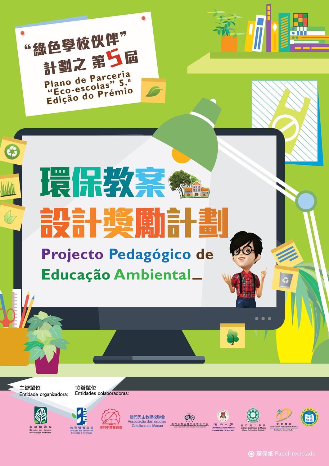 由環境保護局主辦,教育暨青年局、澳門中華教育會、澳門天主教學校聯會、澳門生產力暨科技轉移中心、澳門大學、澳門理工學院、旅遊學院以及澳門科技大學協辦的“綠色學校伙伴”計劃之第五屆《環保教案設計獎勵計劃》現正接受報名,得獎隊伍除獲得豐富的獎金以及參與頒獎禮外,更有機會獲邀參與由本局每年所舉辦的環境教育考察交流團。歡迎現職本澳的教育界人士以及持有澳門居民身份證,現正就讀各大學或大專院校之學生踴躍參與,共同推動澳門環境教育的發展。