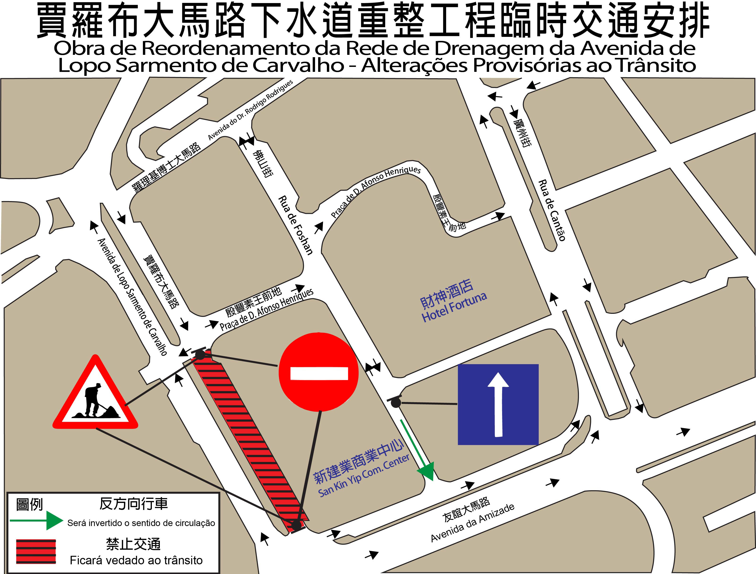 民政總署本月6日(周三)於賈羅布大馬路建造新污水排水渠,以提升污水處理能力。配合工程,介乎殷豐素王前地與友誼大馬路之間的路段由當日上午10時起實施封閉交通,介乎佛山街內路與友誼大馬路內路之間的一段佛山街臨時改作反方向行車,途經該處之車輛需往友誼大馬路方向行駛。期間,相關路段部分咪錶泊車位及電單車泊車位會暫停使用。工期約61日。