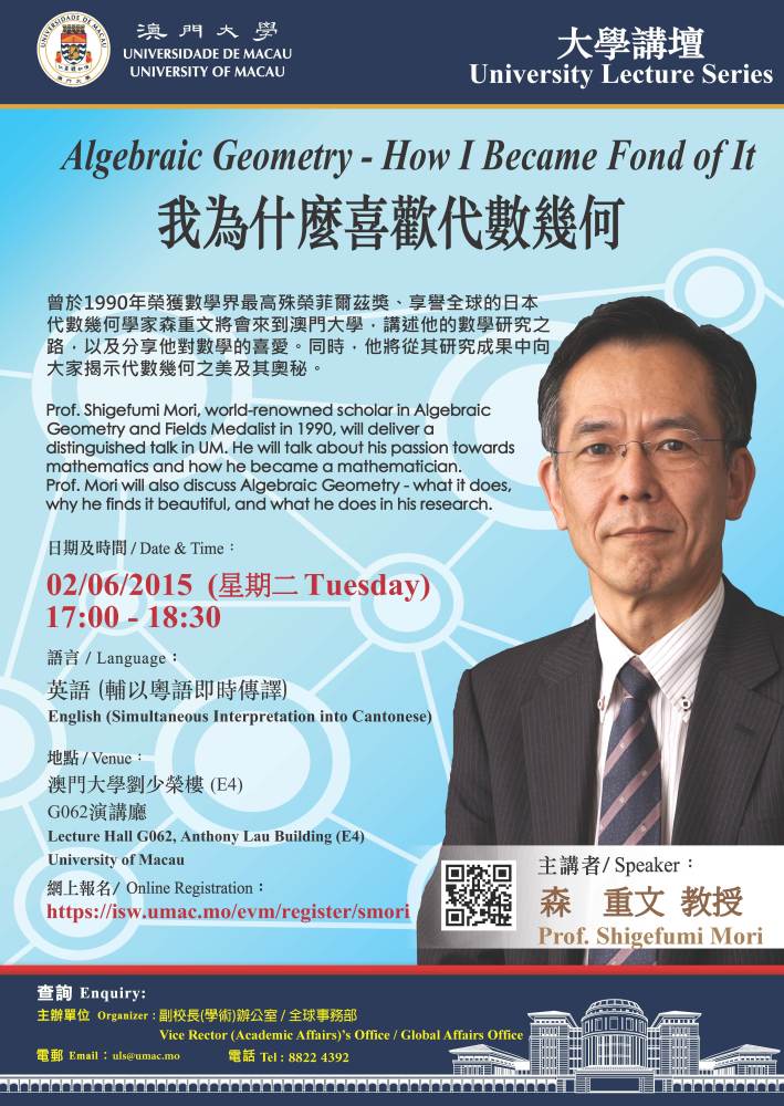 由澳門大學舉辦的首場“大學講壇",邀請到世界著名數學家、1990年菲爾茲獎得主森重文教授擔任主講嘉賓,題為“我為什麼喜歡代數幾何”,森重文教授將分享他的數學研究之路,向大眾揭示代數幾何之美及奧秘。講座將於6月2日舉行,歡迎各界人士參與。