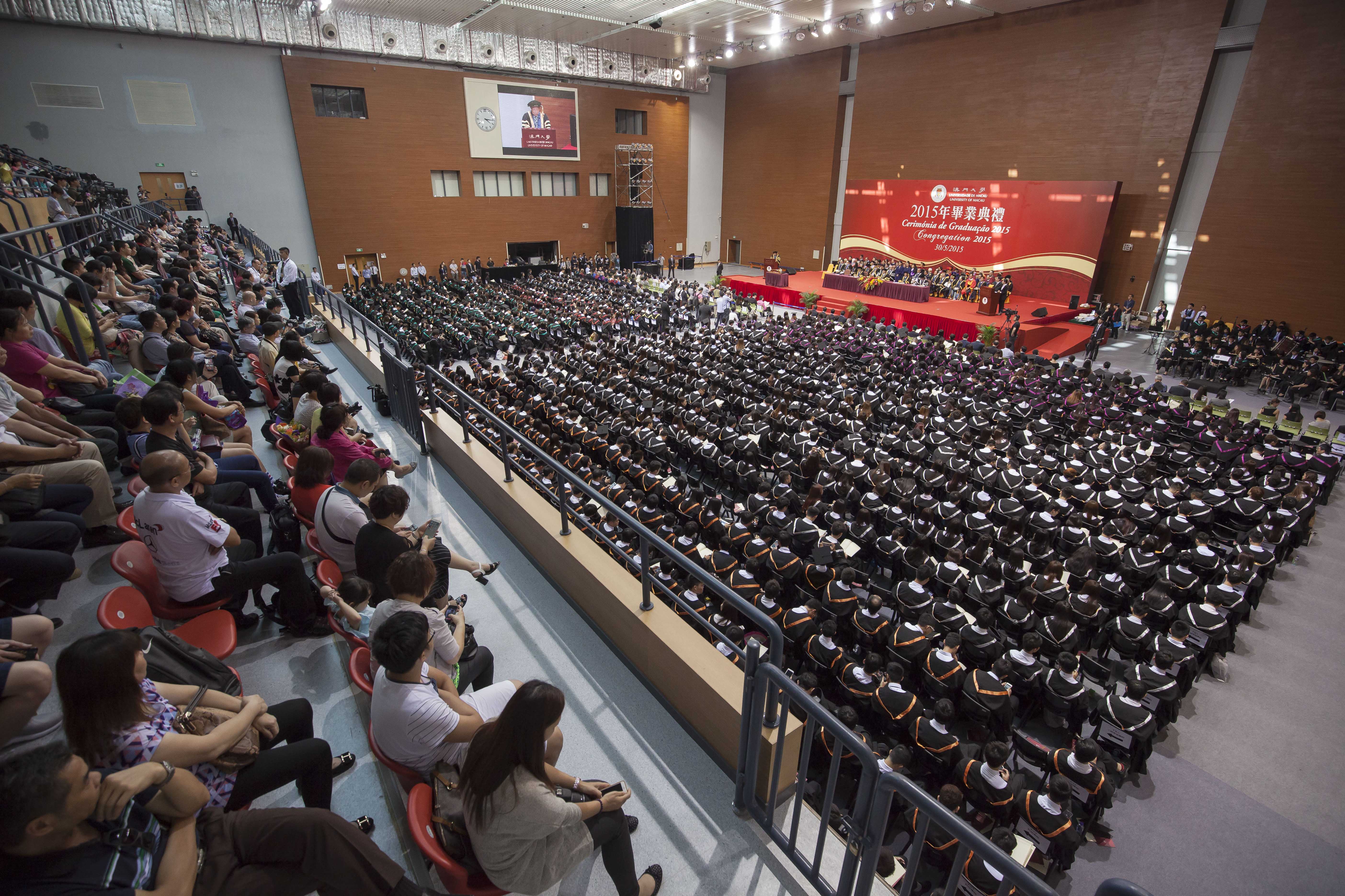 澳門大學今(30)日在澳大綜合體育館隆重舉行了2015年畢業典禮,向出席的一千多名畢業生頒發證書。行政長官兼澳大校監崔世安表示,澳大的國際影響力不斷提高,為澳門國際形象的提升提供了正能量,注入了新内涵。他相信澳大將在澳門的高等教育範疇內繼續佔據十分重要的地位,為促進本澳高等教育穩步發展和總體提升作出重要貢獻。