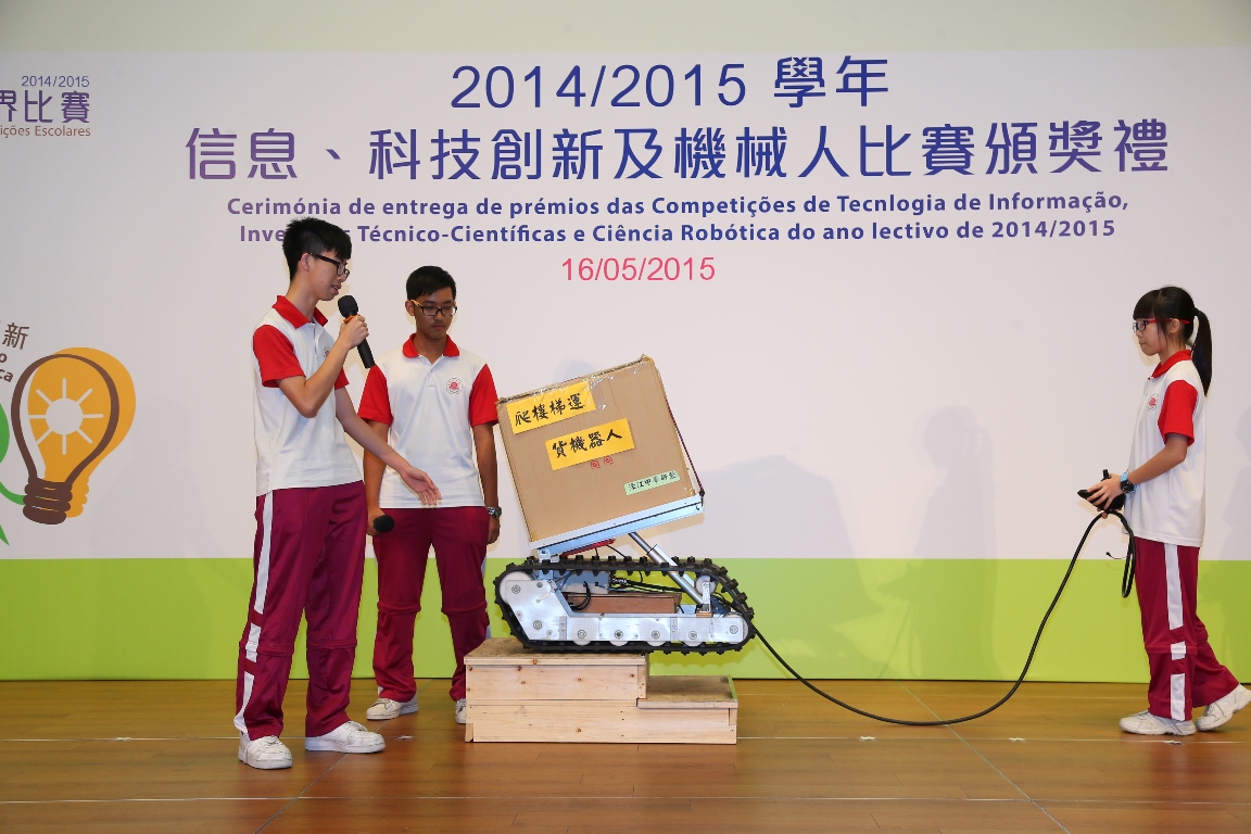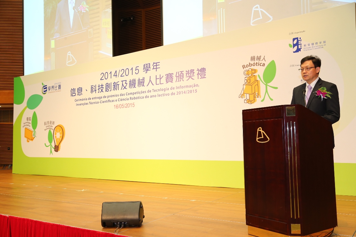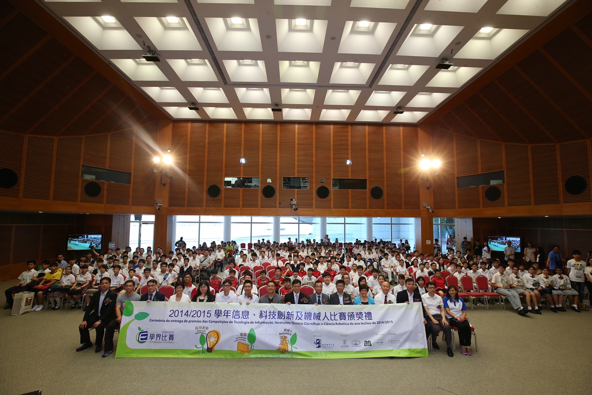 由教青局主辦的“2014/2015學年信息、科技創新與機械人比賽頒獎禮”於5月16日假澳門科學館會議中心順利完成。教青局希望透過“第13屆全國中小學信息技術創新與實踐活動澳門區選拔賽”、“澳門青少年科技創新作品選拔活動2015”、“澳門青少年綜合機械人科普活動選拔大賽2015”及“澳門科學與工程大獎賽2014”,甄選出優秀隊伍代表澳門申報“第30屆全國青少年科技創新大賽”及“第15屆明天小小科學家”獎勵活動,同時將組織學界代表隊參加共8項國際性、全國性及地區性賽事。