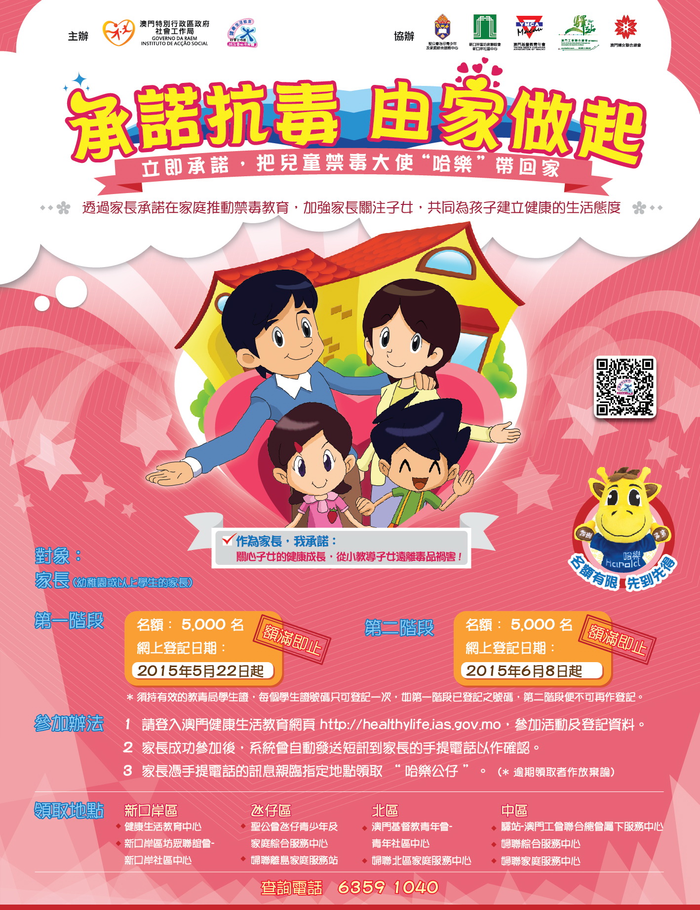 由社會工作局主辦的“承諾抗毒 由家做起”活動深受家長歡迎,首階段活動5,000個名額不足兩天便已額滿,而第二階段活動5,000個名額由6月8日起接受網上登記,額滿即止,錯過了首階段活動的家長,請把握機會參與。
