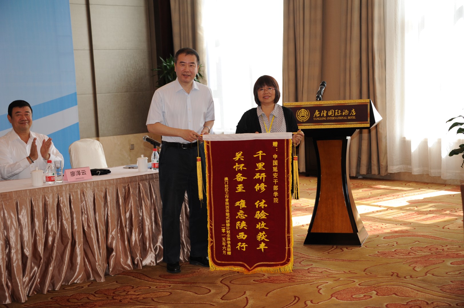 2015年“澳門社區工作者陝西體驗式研修計劃”於6月11日在西安舉行結業式,全國政協副主席何厚鏵,全國政協港澳臺僑委員會主任楊崇匯,中聯辦副主任陳斯喜,全國政協常委徐澤、廖澤雲、顏延齡,全國政協文史和學習委員會副主任梁華,陝西省政協副主席孫清雲,澳門基金會行政委員會副主席張裕,全國政協委員賀定一、林金城、黎振強、陳錦鳴、吳小麗,中國延安幹部學院常務副院長陳燕楠等出席了儀式。主辦單位寄語學員認真總結參加學習實踐活動的收穫,回澳後在自己的崗位上,都能夠繼續以澳門社區工作者該有的精神面貌,為澳門的社區服務作出更大的貢獻。