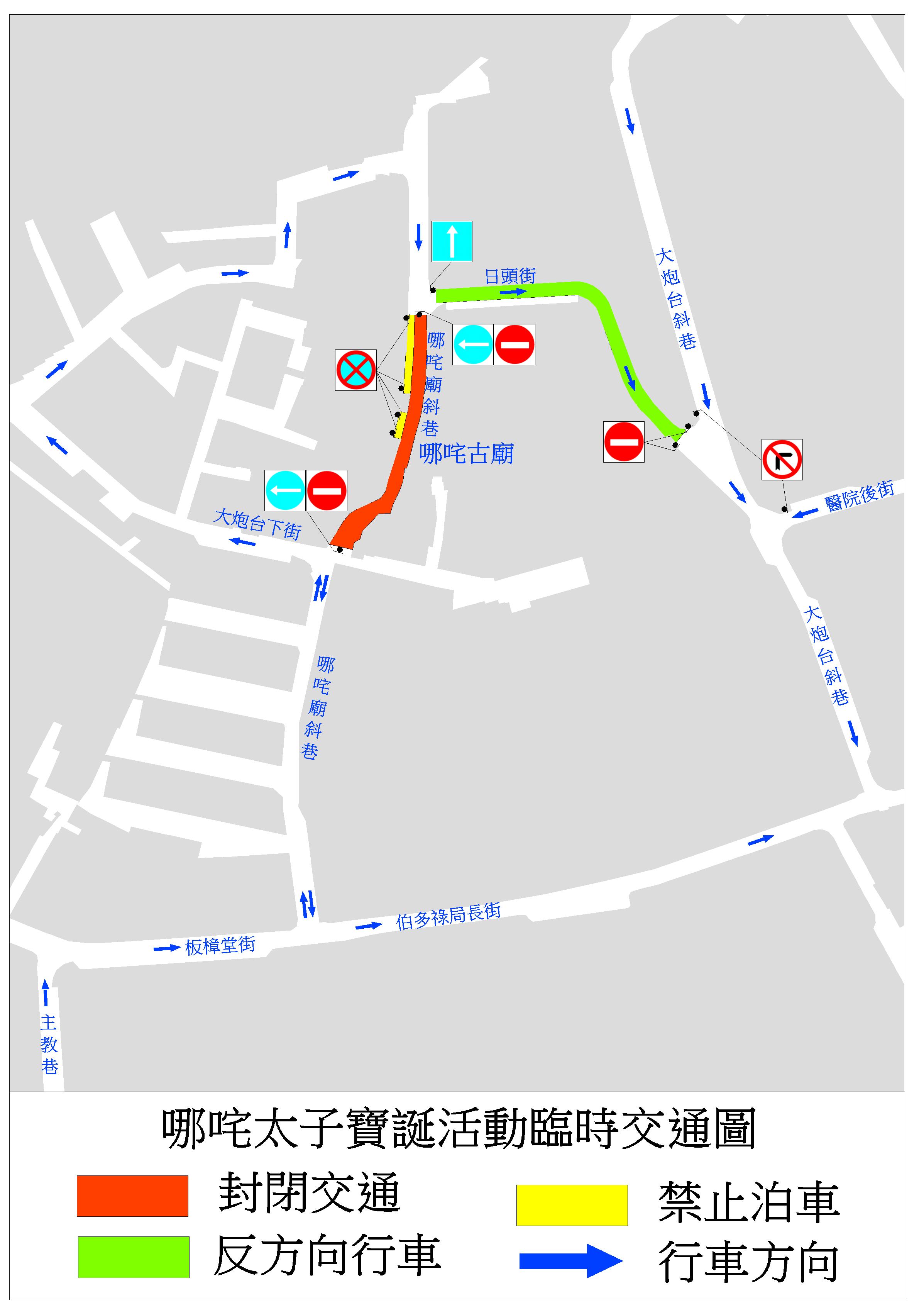 介乎日頭街與老饕巷之間的一段哪咤廟斜巷於7月2日(周四)下午5時至翌日下午2時實施封閉交通,禁止車輛駛入。同時,日頭街改作反方向行車,即車輛須由哪咤廟斜巷往大炮台斜巷方向行駛;期間禁止車輛由大炮台斜巷及醫院後街進入日頭街;車輛需改行板樟堂街前往哪咤廟斜巷、大炮台下街及日頭街。