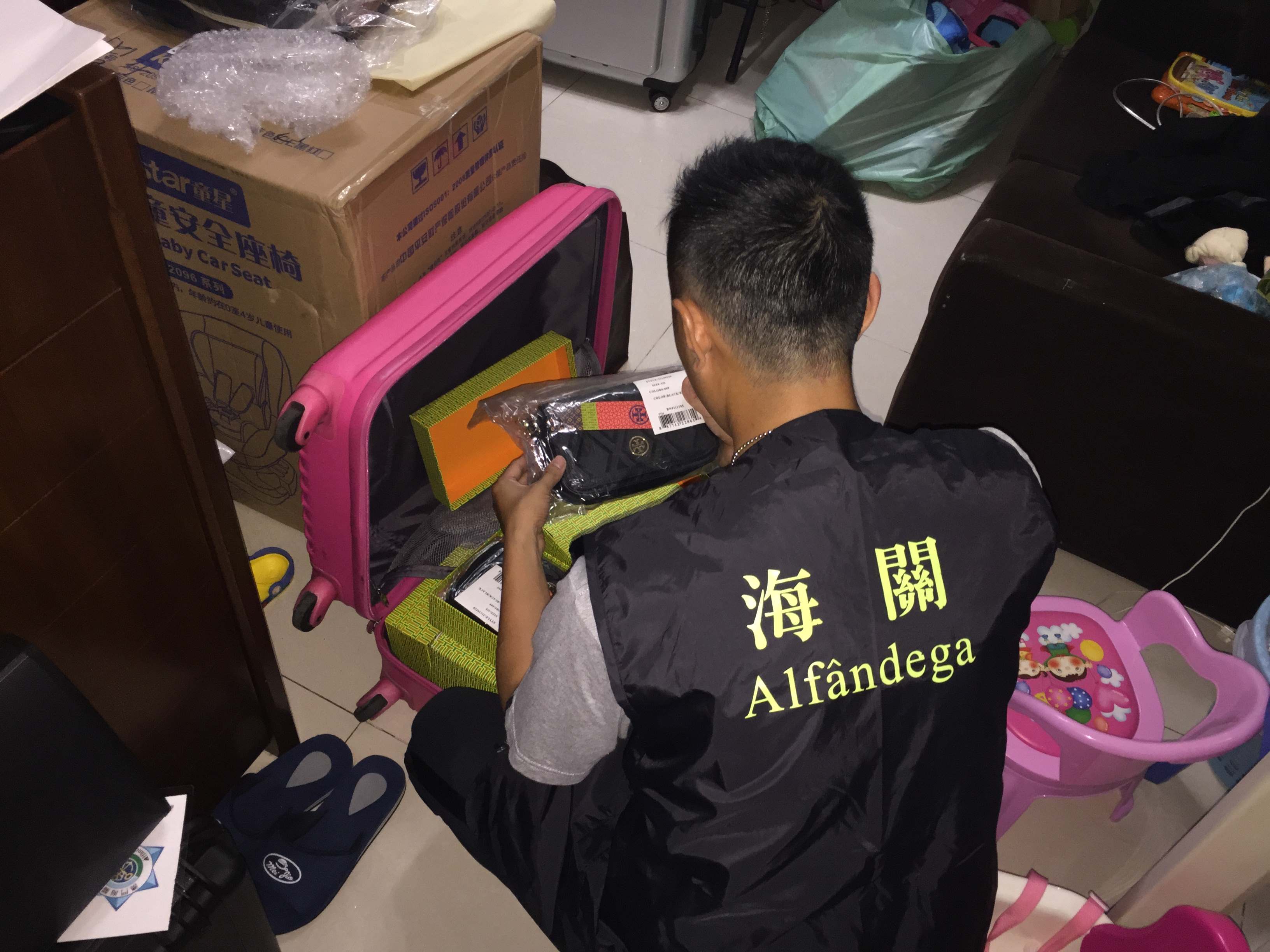 於六月二十九日,海關知識產權廳反互聯網侵權偵查人員在經過長期監察及收集資料,在掌握舉報所指的犯罪證據後,先後對目標人物和單位採取突擊行動。行動期間,在涉案人位於北區某大廈的單位內查獲假冒國際知名品牌商標包括有:「TORY BURCH」及「MIU MIU」之手袋及銀包等假冒產品,合共十七件。據初步調查顯示,有關貨物經由涉案人自行在外地訂購,再親自從外地帶回澳門並在嫌犯住所收藏,嫌犯聲稱入貨價格為二千一百元至二千三百元人民幣不等,出售價格為三千港元。所有緝獲物若以正品正價出售,約值十五萬澳門元。銷售方式主要利用電子社交平臺作工具,於互聯網上的社交群組中發佈資訊,由客戶在該社交平臺的群組上選購,再直接相約指定地點取貨並付款。上述物品經核實,其品牌商標已在澳門特區政府經濟局作出合法註冊登記,其中「TORY BURCH」貨品經品牌權利人代表作初步鑑定,初步核實涉案證物從品質、手工、標籤及手牌等作比較,均與正品不一,並確認為假冒貨品。除上述物品外,海關並把懷疑用作涉案工具的兩部手機等物品一併扣押。