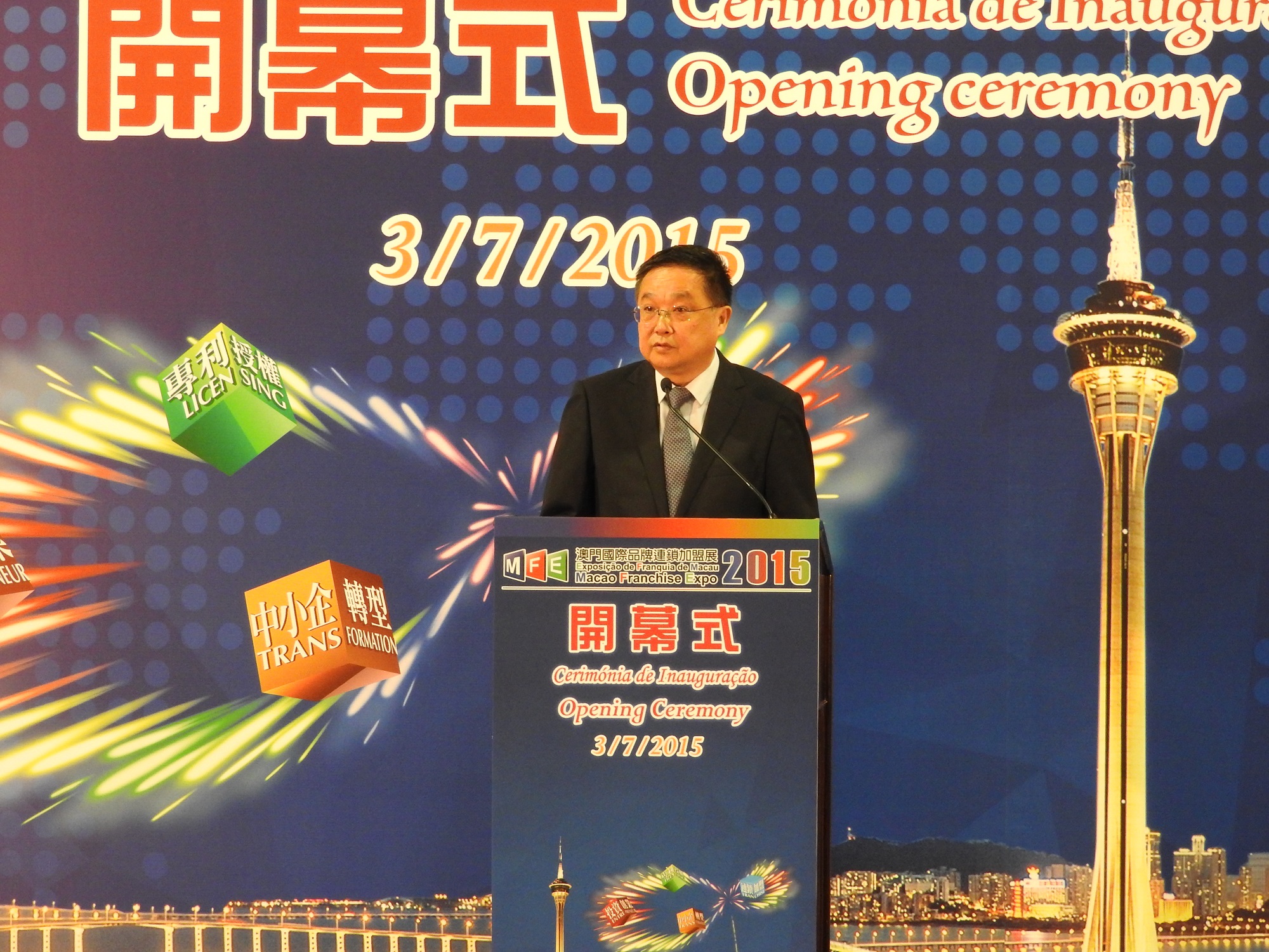 開幕式於今日上午十時舉行,澳門特別行政區經濟財政司司長梁維特、中央人民政府駐澳門特別行政區聯絡辦公室經濟部副部長陳翔、中華人民共和國外交部駐澳門特別行政區特派員公署辦公室副主任郭濤、澳門貿易投資促進局主席張祖榮、澳門特別行政區政府經濟局局長蘇添平、澳門特別行政區政府旅遊局局長文綺華、中國與葡語國家經貿合作論壇常設秘書處秘書長常和喜、澳門中華總商會理事長高開賢、台灣連鎖加盟促進協會理事長李日東、澳門國際品牌企業商會主席蕭婉儀、澳門連鎖加盟商會主席黃仁民、香港專利授權及特許經營協會會長李偉生、葡萄牙特許經營協會理事長Cristina Maria Matos、韓國特許經營協會全北分會會長朴培均主持開幕儀式。儀式後,經濟財政司司長梁維特及各主禮嘉賓參觀展覽,並與參展商交流。