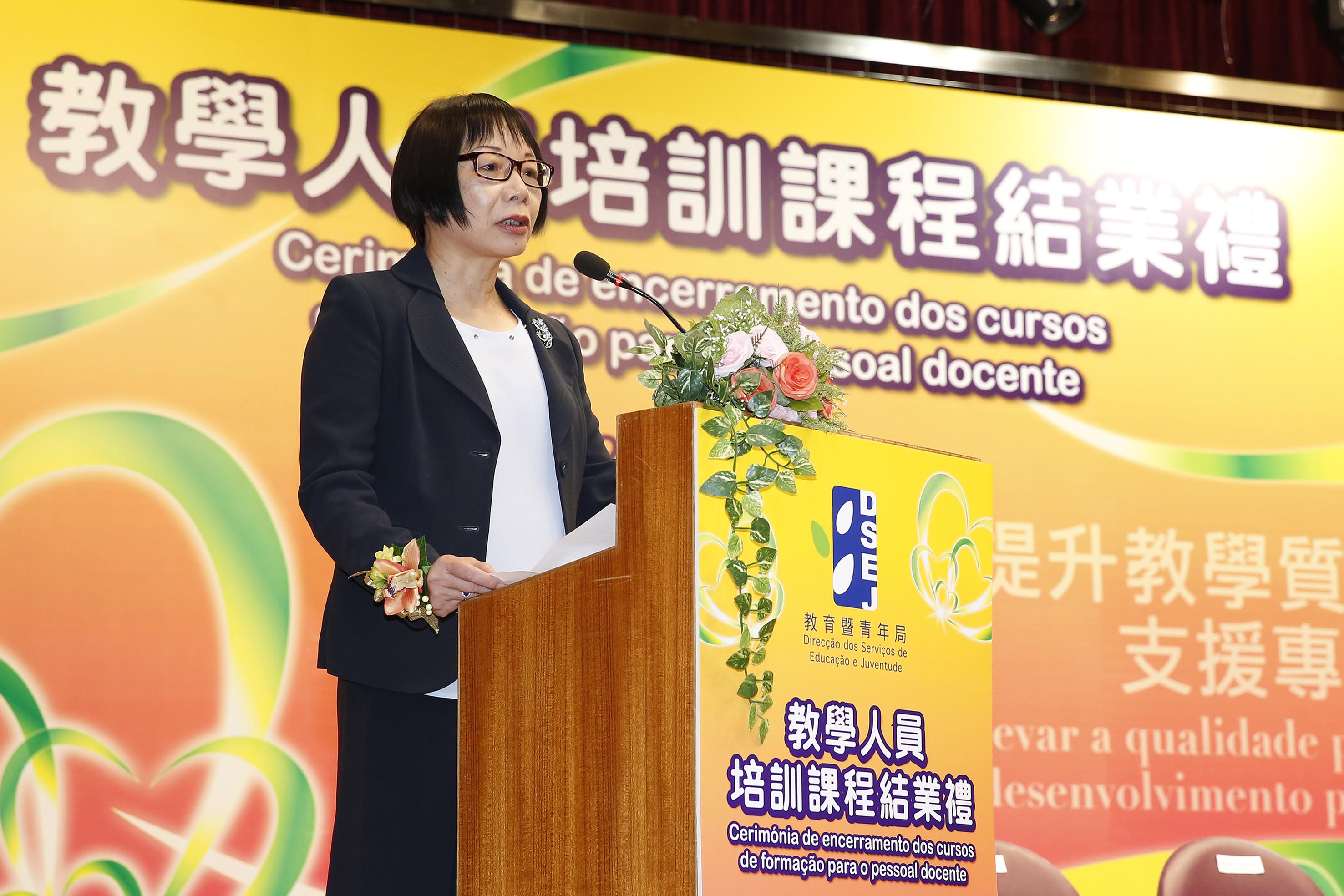 郭小麗在結業禮致辭時勉勵教學人員積極參與專業發展活動,透過參與培訓、研究和實踐,提高專業素養和教學效能,從人才培養上為澳門的可持續發展作出貢獻。典禮上,本學年完成培訓課程的教學人員獲頒授結業證書,並請學員代表分享參與培訓的經歷和完成培訓的喜悅,氣氛熱烈。