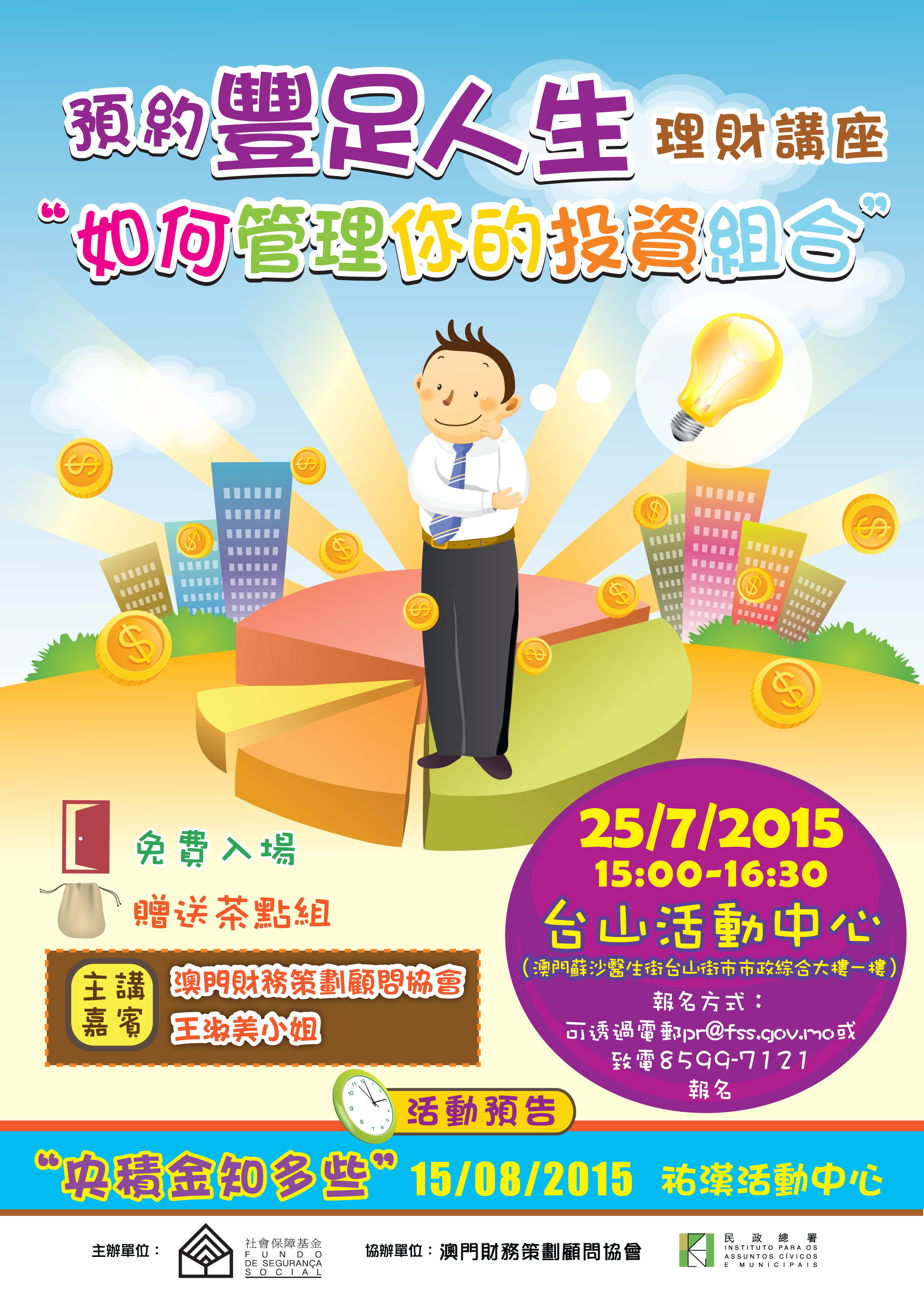 為建立本澳市民對投資理財的正確觀念,社會保障基金持續舉辦公眾理財教育講座,今年的系列講座題為“預約豐足人生”,第三場主講投資組合管理,將定於本月25日(星期六)下午3時至4時30分於台山活動中心舉行,詳情如下: