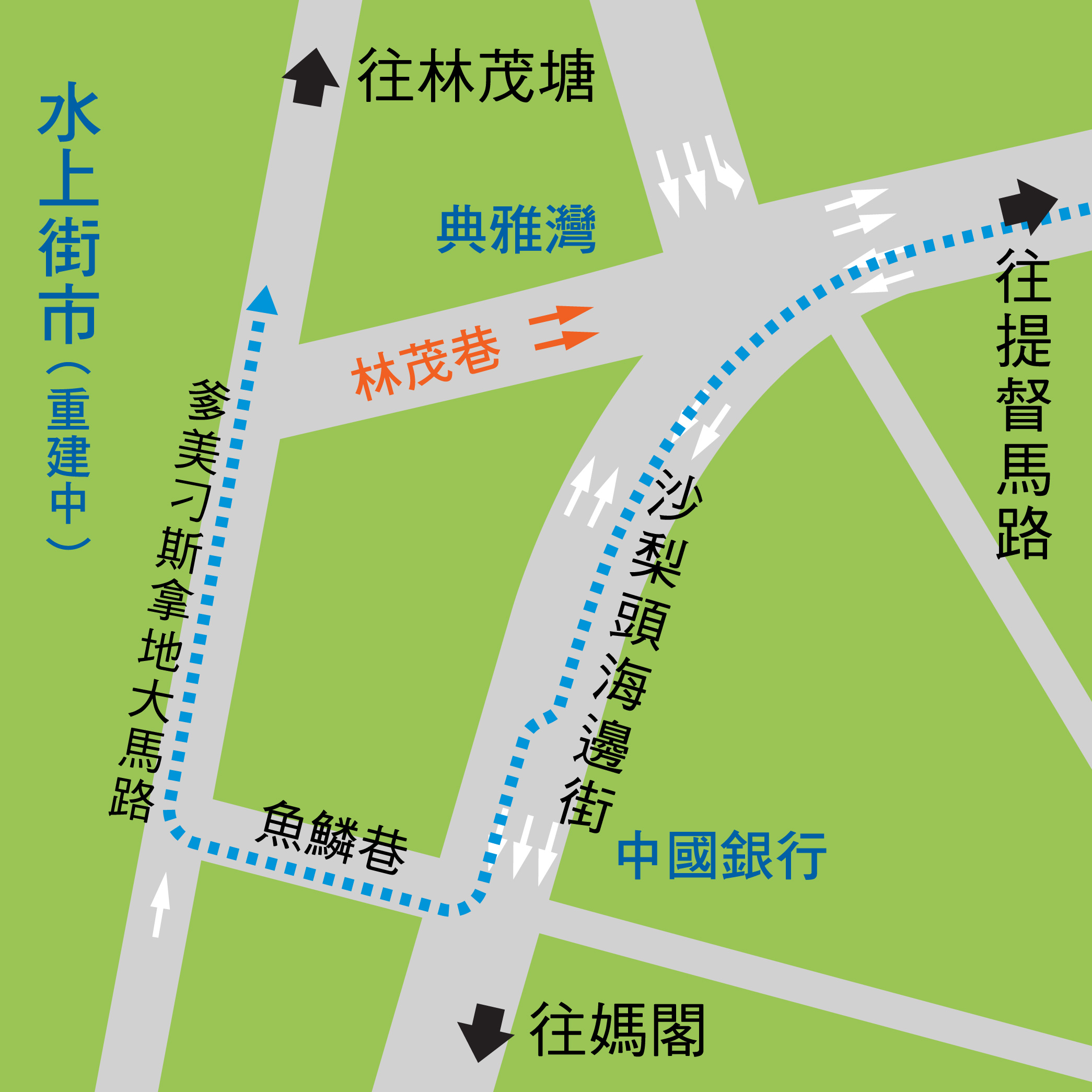經視察內港一帶的交通,現時由提督馬路經林茂巷往水上街市的車輛,會因等候交通燈而阻塞前往媽閣方向的主車流,影響該處行車秩序,同時為疏導由內港前往北區之交通,林茂巷由本月21日(周二)上午10時起改反方向行車,即改為由爹美刁斯拿地大馬路往提督馬路方向行駛,而原來由提督馬路經林茂巷往林茂塘方向的車輛,則改沿沙梨頭海邊街右轉入魚鱗巷後,經爹美刁斯拿地大馬路行駛。
