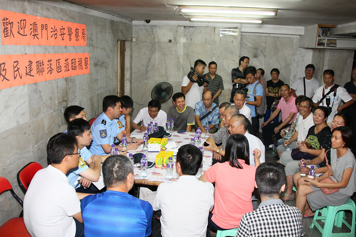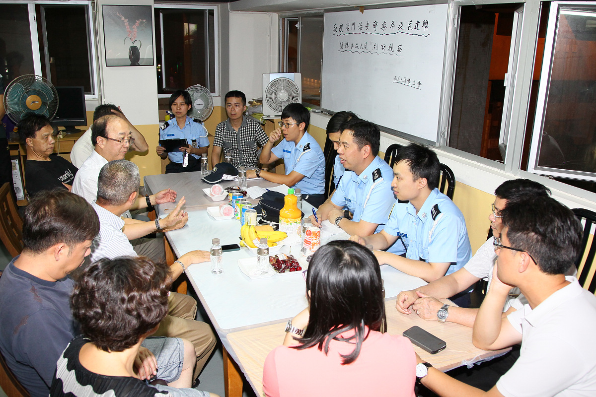 是次活動由治安警察局公共關係處處長趙崇遠副警務總長與該局代表以及立法會議員宋碧琪、民眾建澳聯盟陳德勝理事長、歐陽廣球副理事長等多名社區警務聯絡主任一同帶領下,分別於國際中心、海冠中心及南成大廈進行,與各大廈業主會及國際中心商戶互助會代表進行深入的探討和交流,聽取各委員代表的意見及訴求,並向其介紹警務工作及提供專業建議。通過是次交流,有利於警方收集社區治安情報,作出分析及研究,以展開更針對性的警務措施;亦有利增加居民與警方相互了解,增進警民互信。隨後,治安警察局代表與社區警務聯絡主任及各大廈業主會代表一行三十多人進行實地視察,分別巡視多個區內治安、交通黑點及管理處,共同探討新口岸區的治安及交通問題。