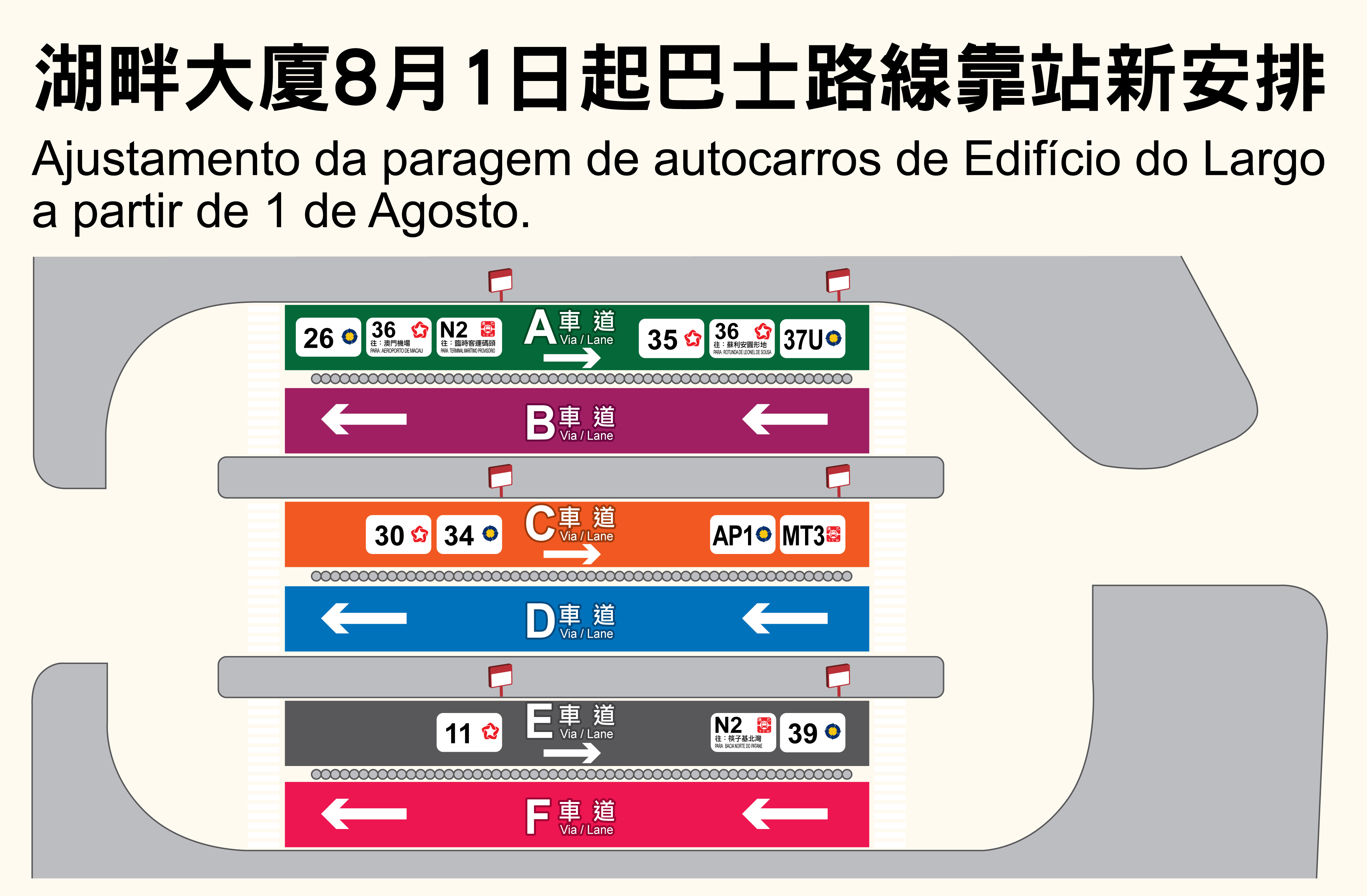 經調整後,由8月1日(周六)首班車起,26、35、36、37U及往臨時客運碼頭的N2停靠A車道(36路線按不同的前往方向分開停靠);30、34、AP1及MT3停靠C車道;11、39及往筷子基北灣的N2則停靠E車道。