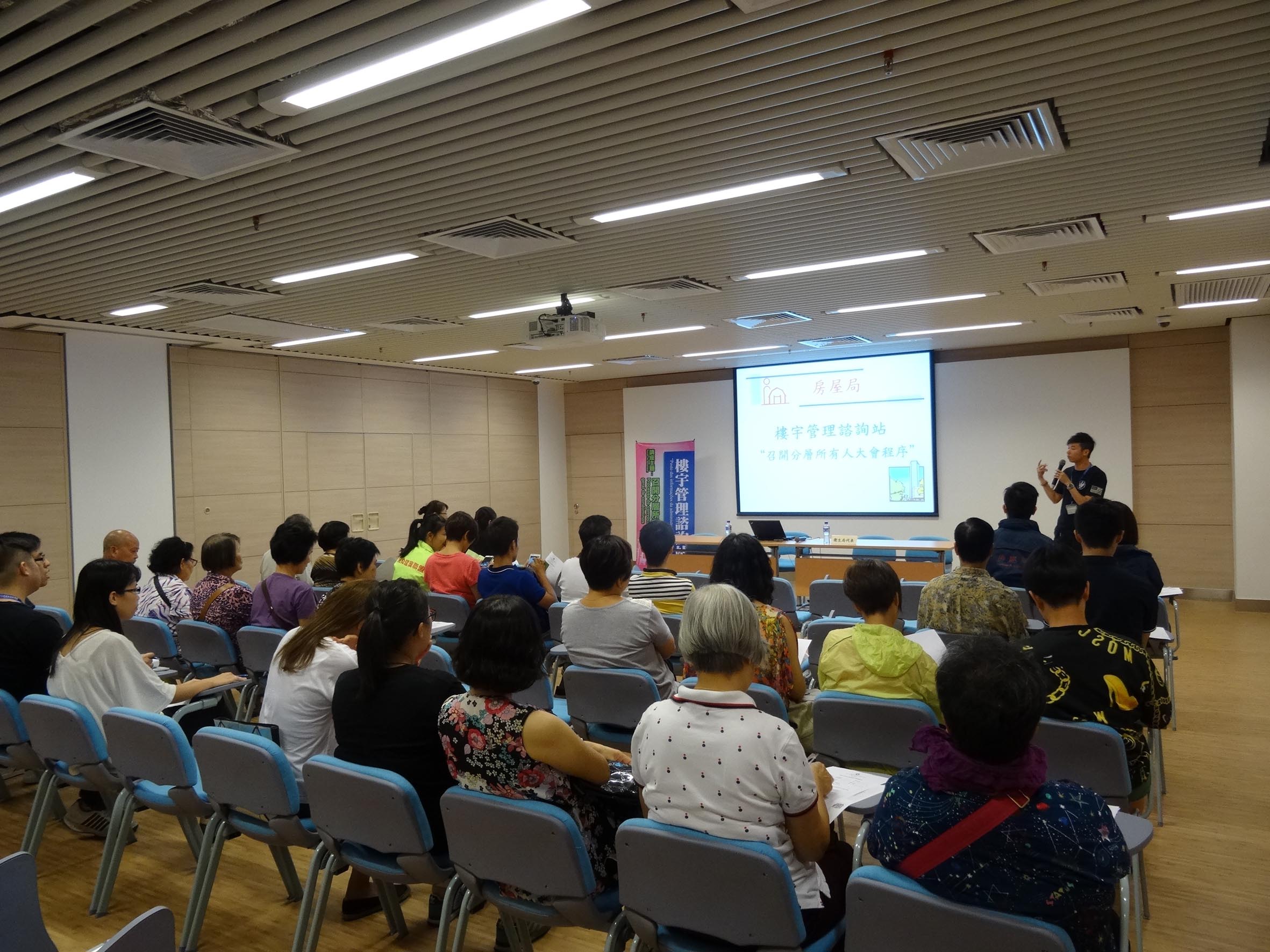 房屋局於7月8日舉辦了“樓宇管理諮詢站”,向離島區居民講解分層建築物所有人大會(俗稱業主大會)程序,同時亦邀請了衛生局代表介紹樓宇公共地方及家居環境衛生的資訊,並即場解答市民對樓宇管理的疑問。