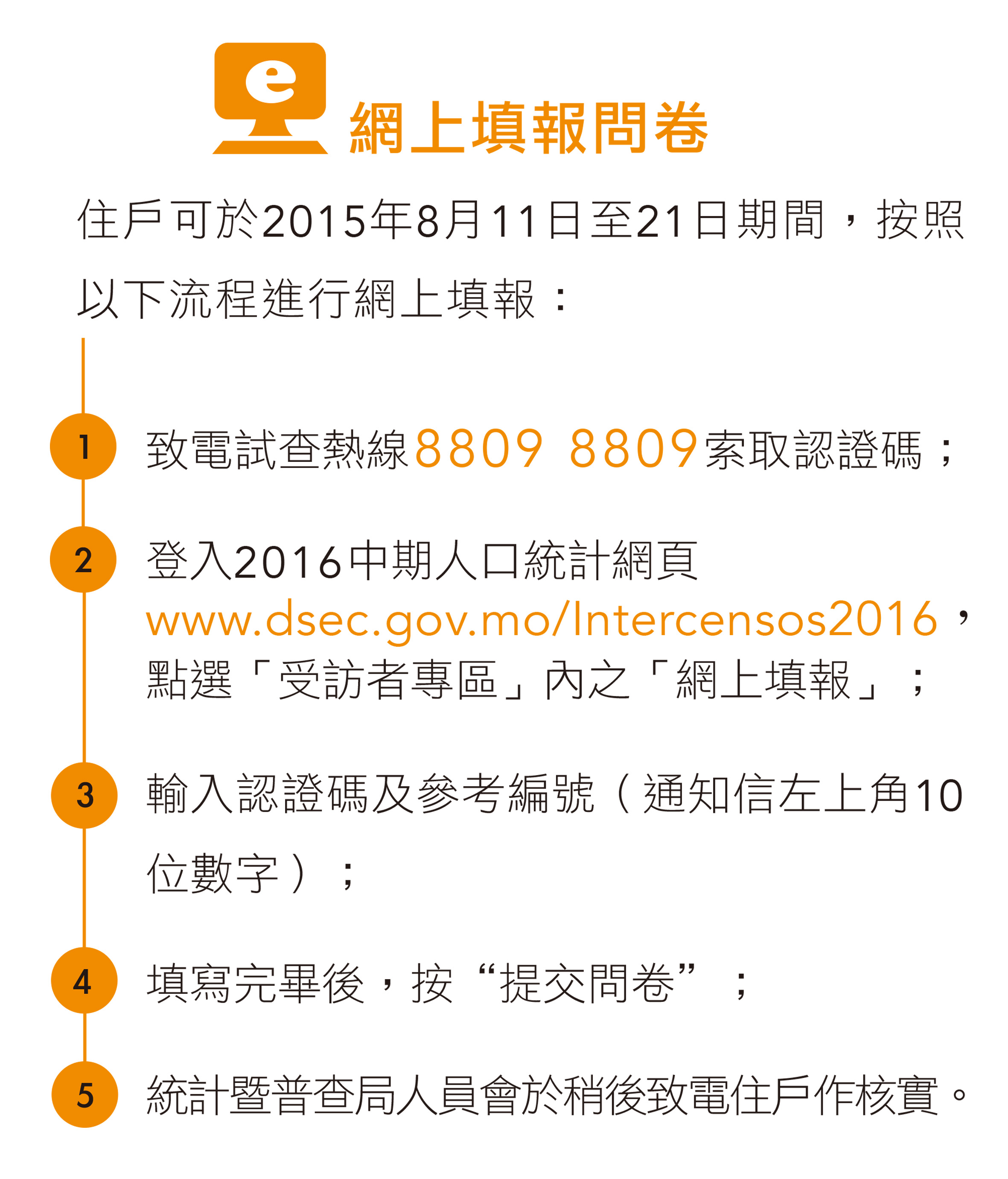 所有調查員均穿著黃色試查工作服、佩戴有效工作證及攜帶試查工作袋,於試查期間到訪被抽中的住宅單位,向住戶收集資料。住戶亦可選擇於8月11日至21日期間登入2016中期人口統計網頁(www.dsec.gov.mo/Intercensos2016)填報問卷。所有收集到的個人及個別住戶資料絕對保密,只作統計用途,請廣大市民放心提供準確資料。如欲查核調查員身份或預約訪問時間,請致電試查熱線8809 8809。