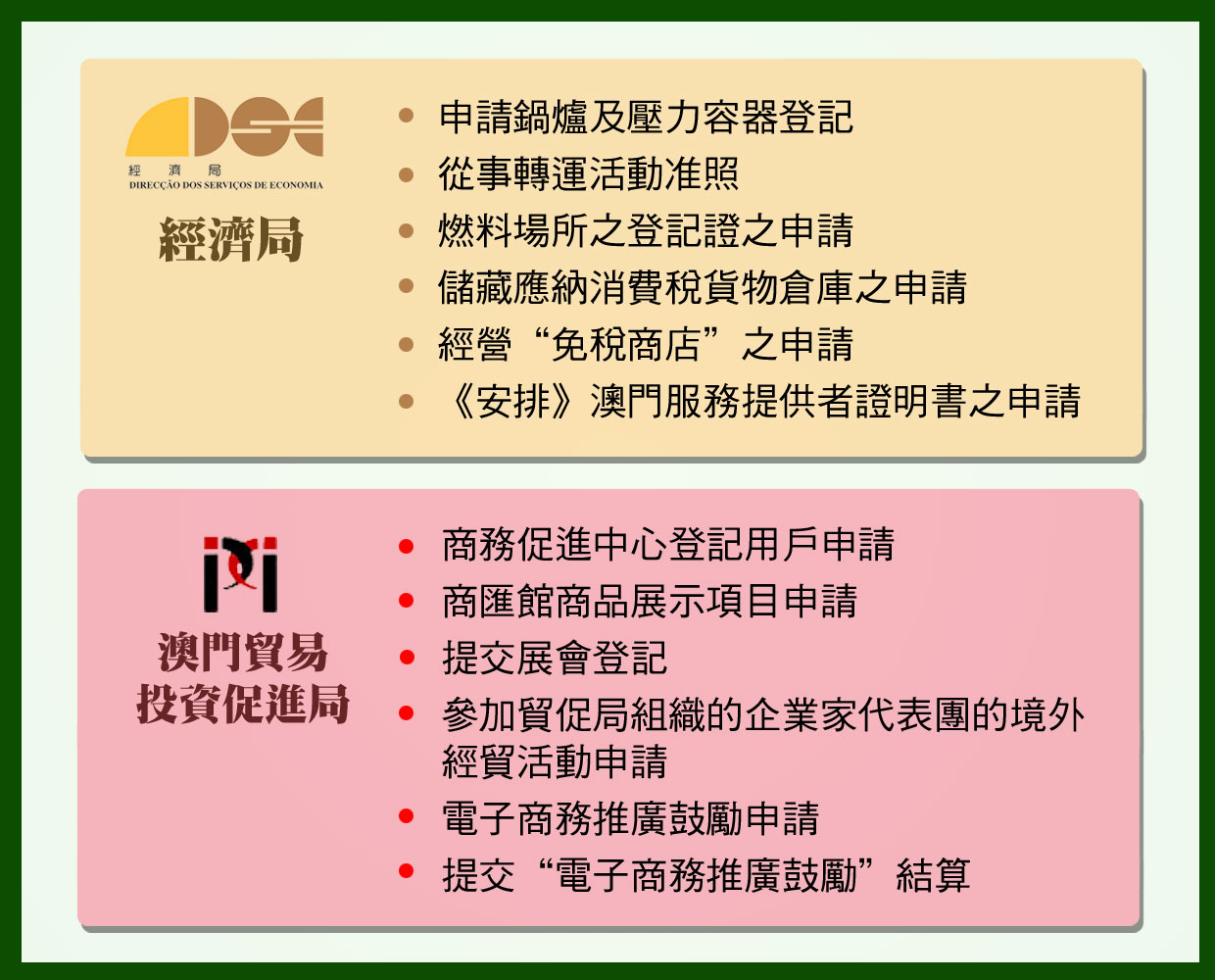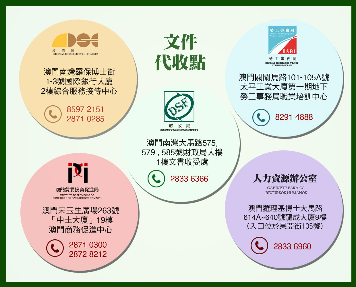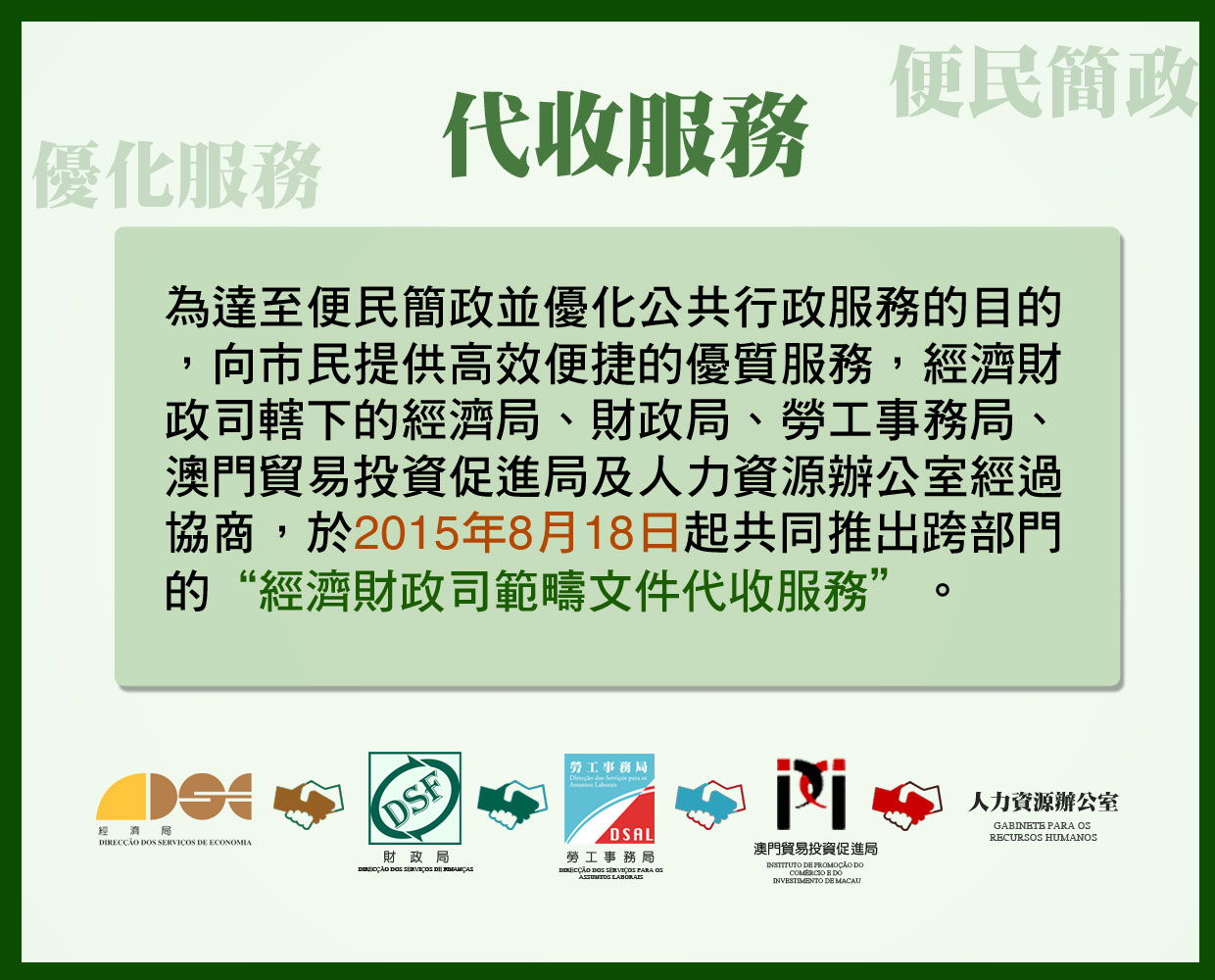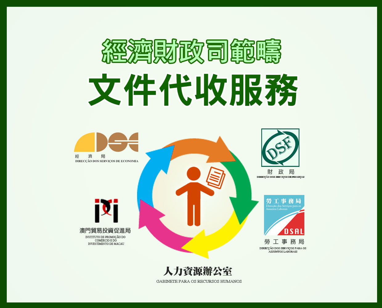為達至便民簡政並優化公共行政服務的目的,向市民提供高效便捷的優質服務,經濟財政司轄下的經濟局、財政局、勞工事務局、澳門貿易投資促進局及人力資源辦公室經過協商,於18日起共同推出跨部門的“經濟財政司範疇文件代收服務”。
